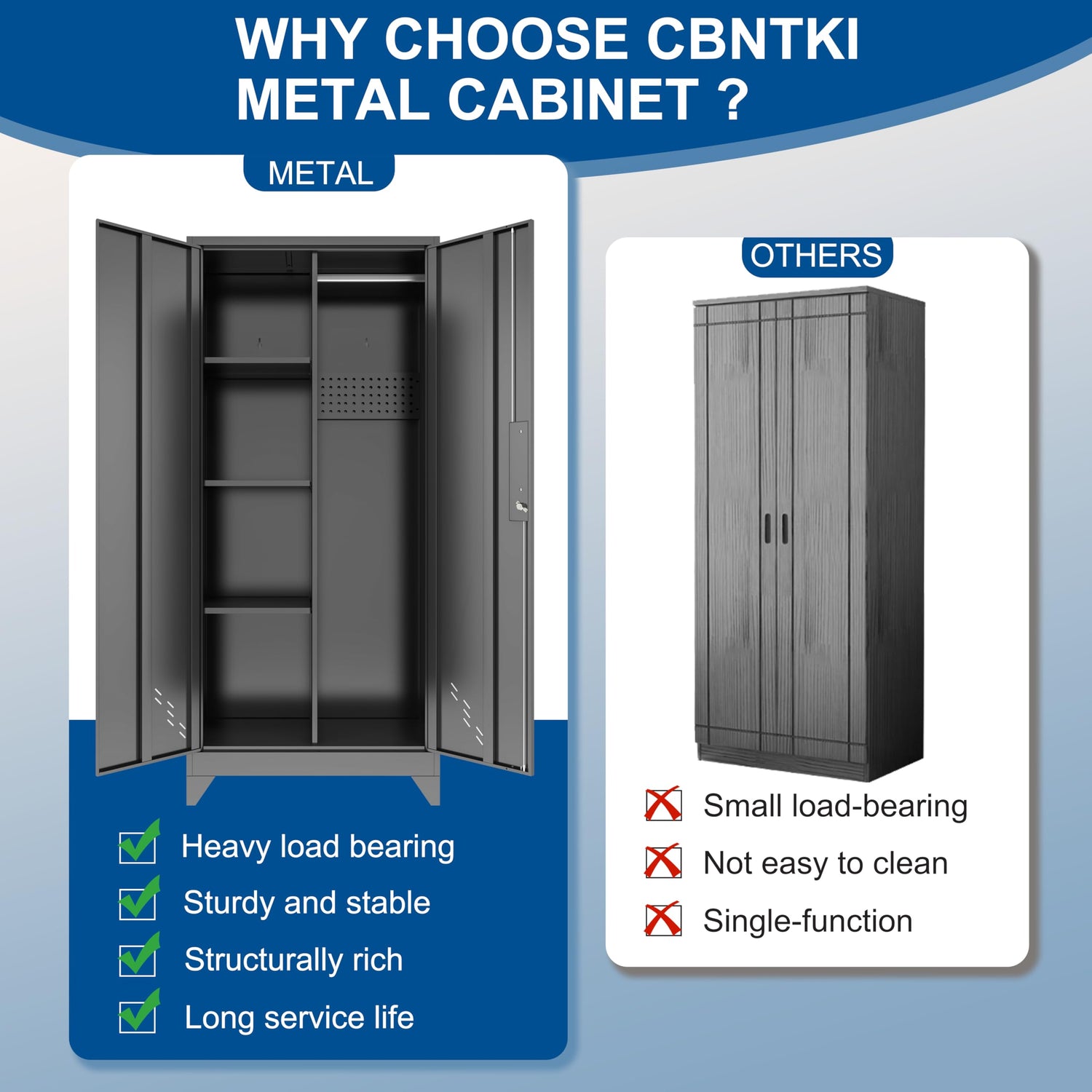 - 【Outdoor Broom Closet Cleaning Locker Multi Purpose】 The cleaning cabinet can store various items such as mops, brooms, fishing rods, towels, clothes, documents. It can be used in offices, storage rooms, garages, homes, warehouses, laundry rooms, basements, or any place that requires safe storage space