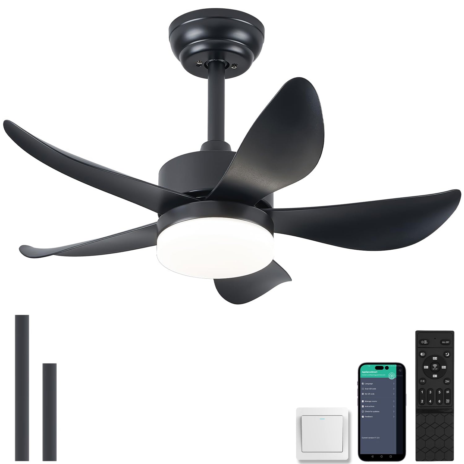 - Ceiling Fan with Remote and App: The ceiling fan with led light can be operating separately.Remote or App is fine.You can also control light by wall swithch(Please note,wall switch not included,and it can not control fan,only light).You can set dimmable ceiling fan 2H timing via Remote or 1/2/4/8 timing via App if you need.(After fixed,the remote can be used as wall switch)