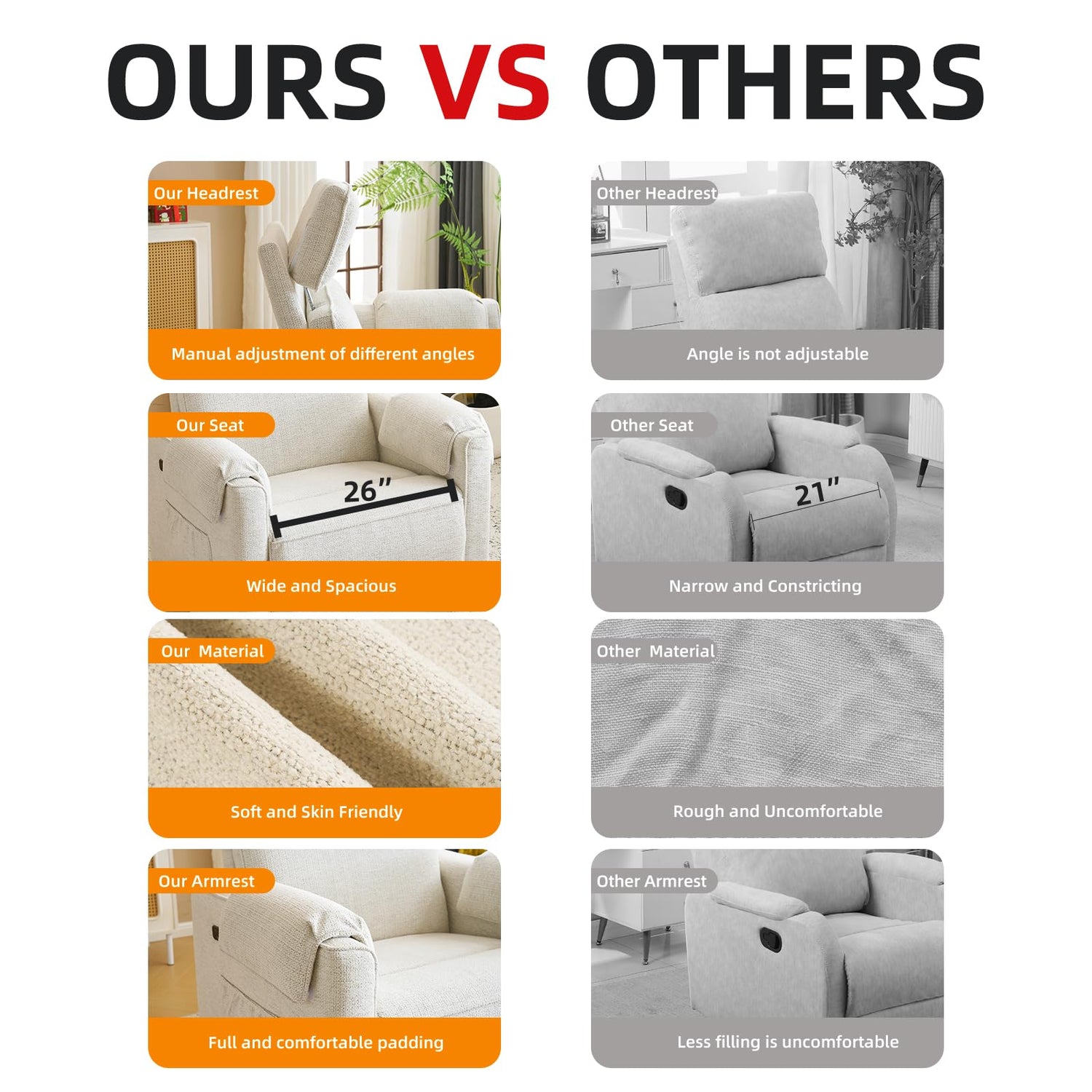 - 26" Extra Wide Seat: The 26" wider and larger seat is not only spacious and comfortable, but also suitable for a wide range of people, especially mothers and babies, as well as tall adults who can play and rest with their babies on the nursery recliner. The skin-friendly and comfortable chenille fabric and the stylish and beautiful design add a touch of sophistication to living rooms, bedrooms and nurseries.