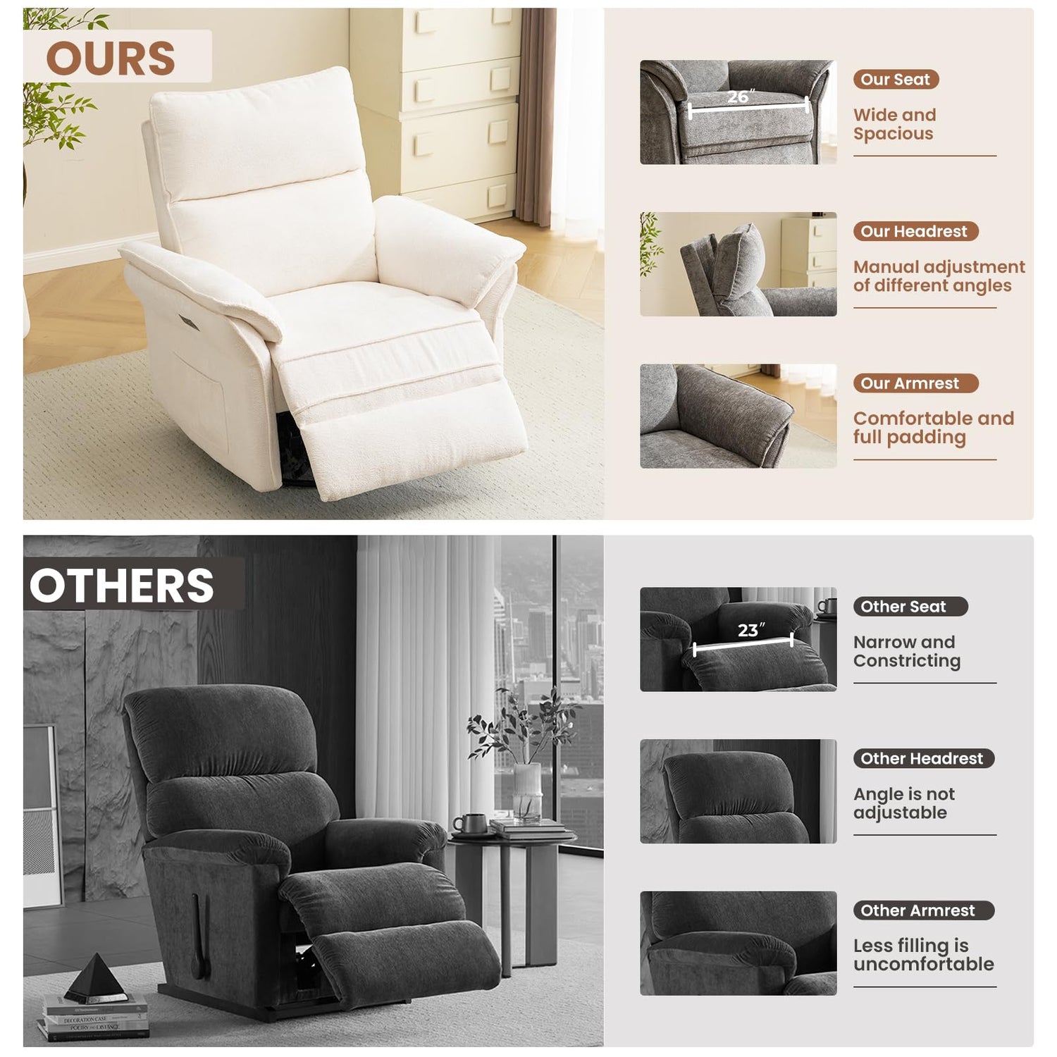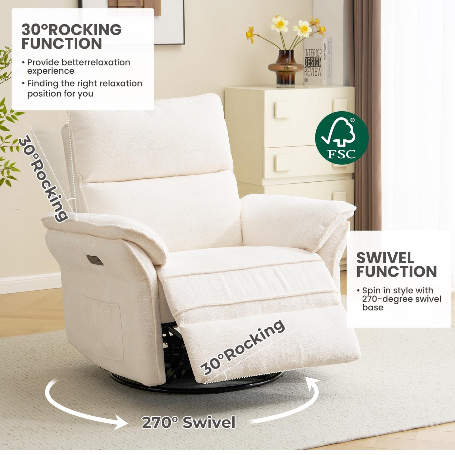 Rhevoy Oversized Power Recliner Chair Swivel Glider with Massage and Heat, Rocker Nursery Recliner for Adults with Adjustable Headrest, 26" Extra Wide Nursery Chair with Overstuffed Armrest,White
