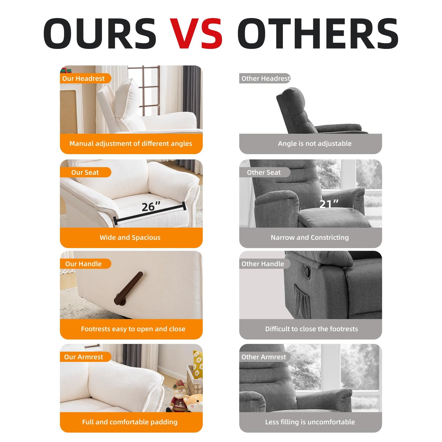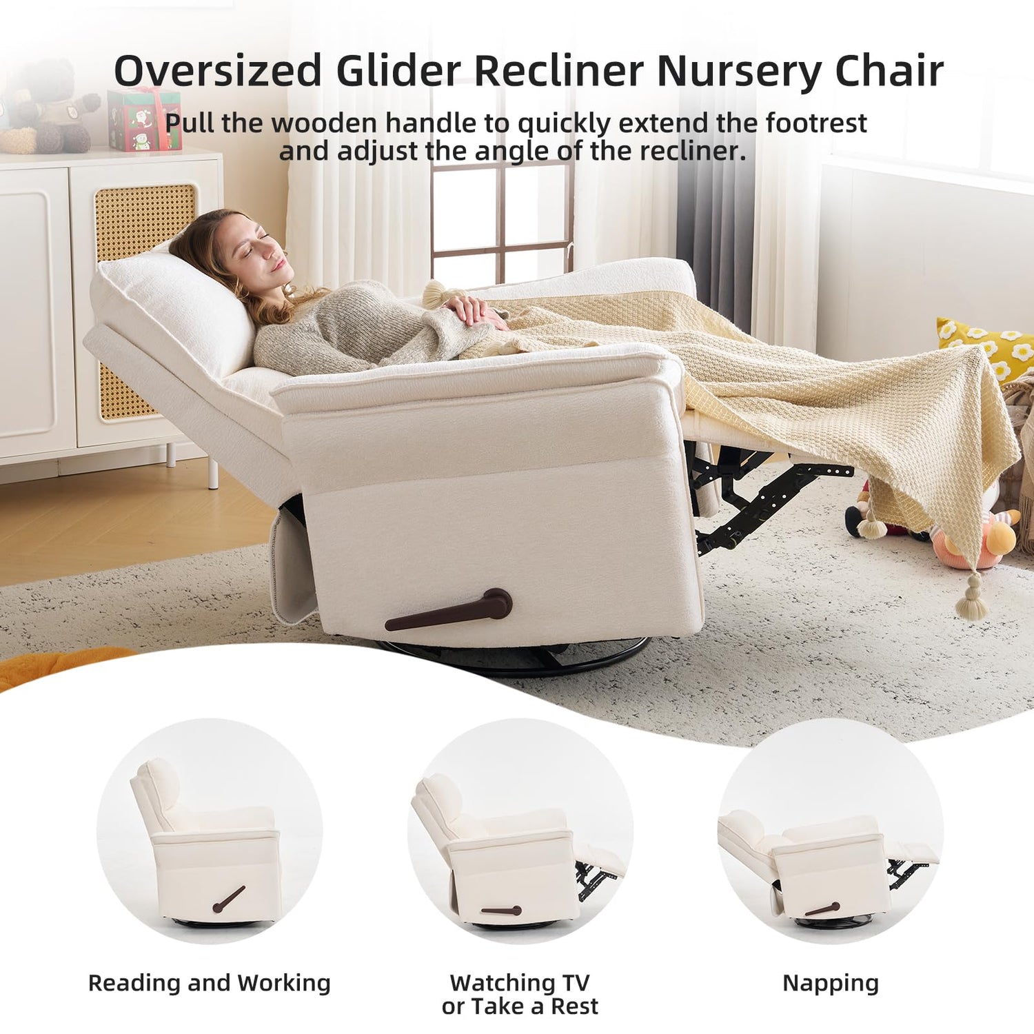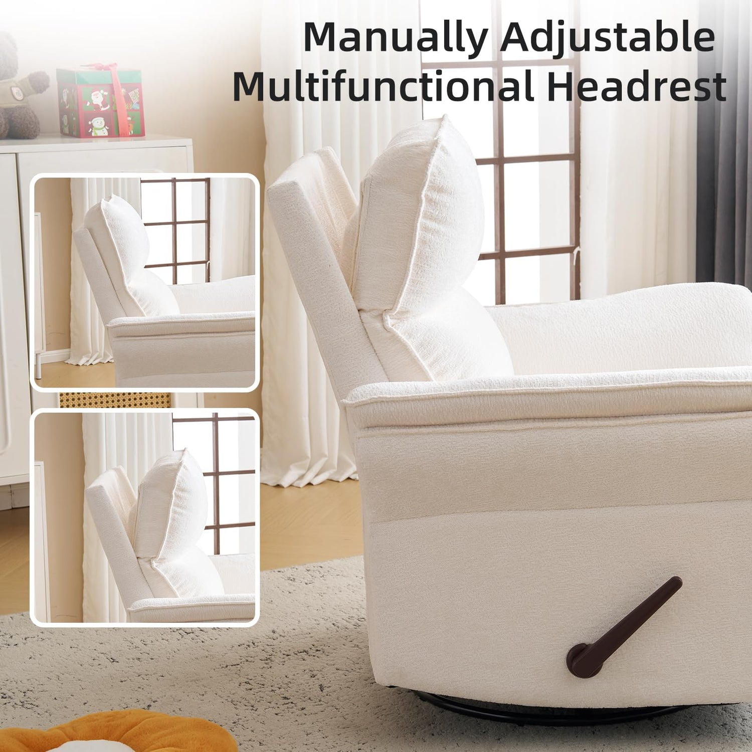 Rhevoy Oversized Recliner Chair, 26" Extra Wide 360° Swivel Rocker Recliner with Adjustable Headrest, Chenille Glider Rocking Nursery Chair with Overstuffed Armrest, Lumbar Support, White