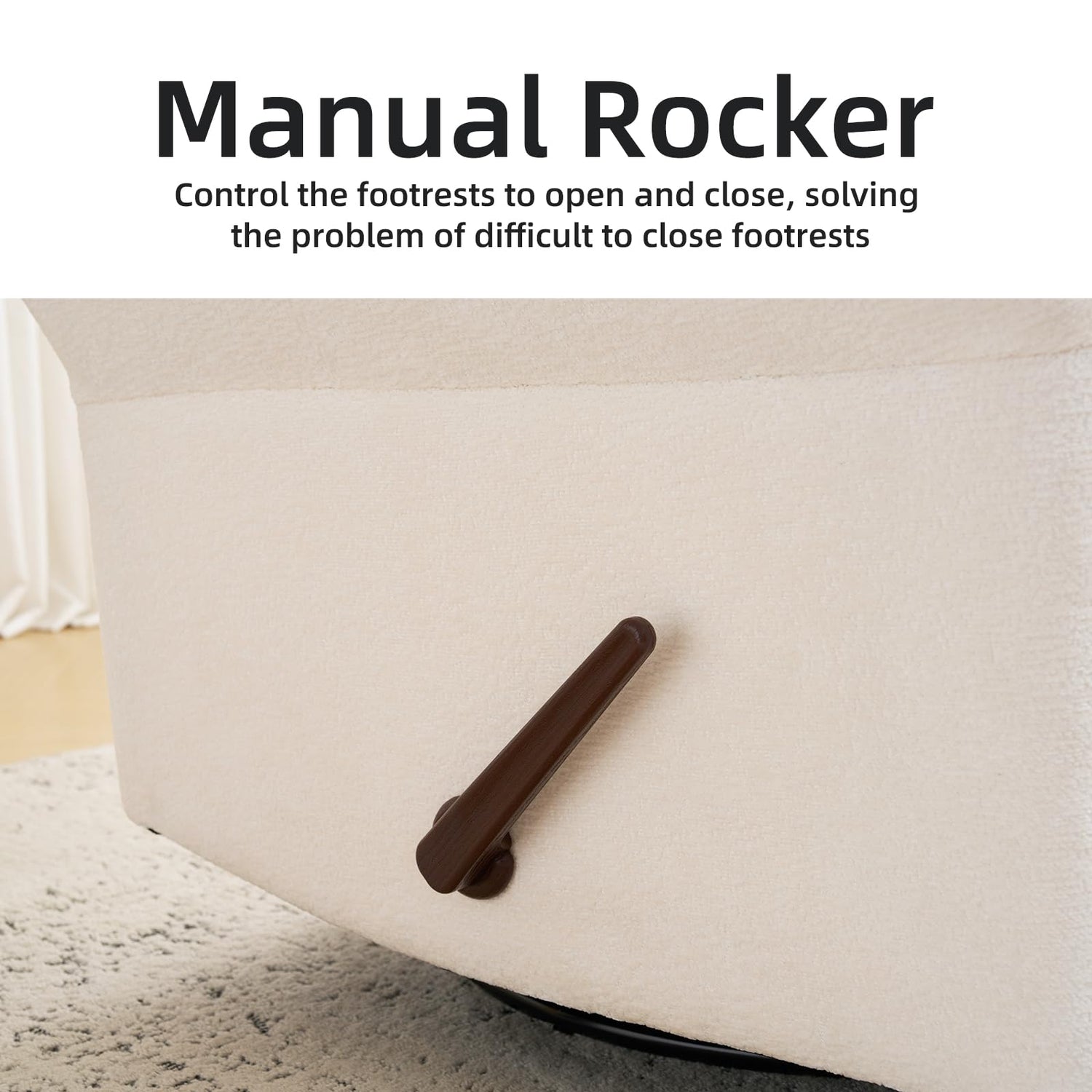 - Oversized Swivel Rocker Recliner Chair: Product Size: 29"D x 33"W x 41"H, Seat Size: 26"W x 20"D, Weight Capacity: 350 lbs.This glider rocking chair offers a reclining angle of 90°-135°, so you can relax, read and sleep with a gentle push of the control lever. It also features a 360° swivel and 30° rocking, it provides maximum comfort and convenience whether you're relaxing or soothing your baby to sleep. Metal base and solid wood construction for durability.