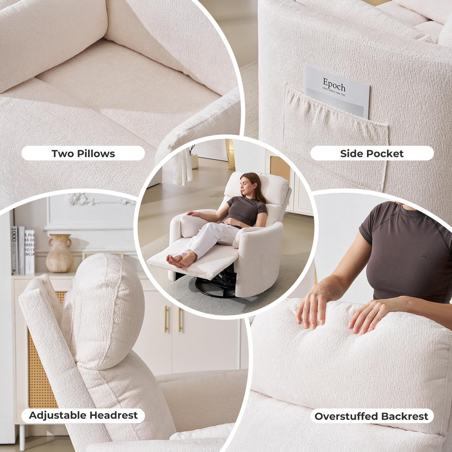 - Oversized Swivel Rocker Recliner: Product size: 38.7" (d) x 38.5" (w) x 43" (h), Seat size: 26" (w) x 22" (d), Weight capacity: 350 lbs. This glider recliner offers a reclining angle of 90°–145°. Simply press the button lightly to relax, read or sleep. It also features a 270° swivel and 30° rocking for maximum comfort and convenience, whether you're relaxing or soothing your baby to sleep. Metal base and solid wood construction for durability.