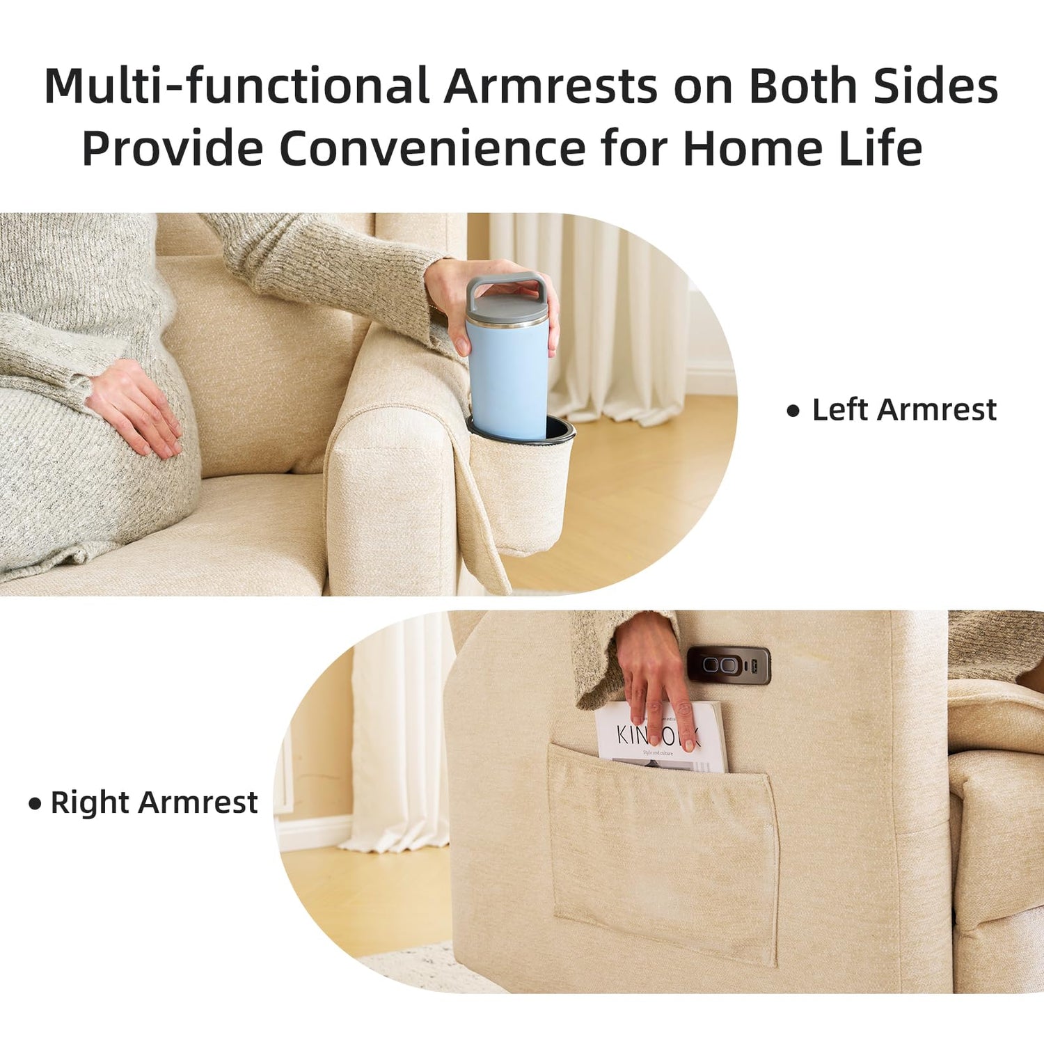 - Multifunctional Armrests: The left armrest of the glider recliner has a removable padded cushion and, as well as a cup holder, a mobile phone pocket and a tissue pocket. The right armrest has a USB and Type-C charging port and a side pocket that is not only convenient for charging but also ideal for storing books, magazines and baby essentials.