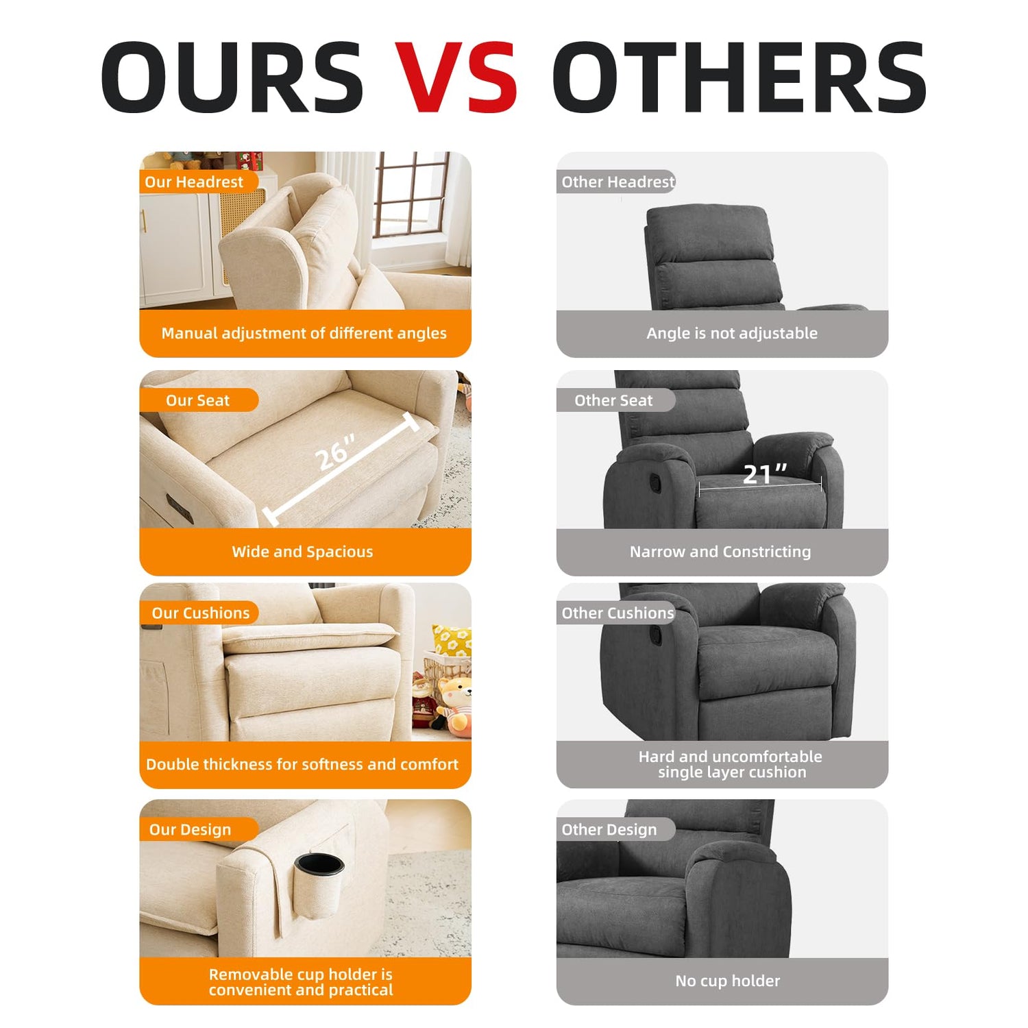 - Adjustable Headrest: The headrest of this glider recliner nursery chair can be manually adjusted to a variety of angles, and its comfortable design helps reduce pressure on the neck and shoulders, providing comfortable support and making it easy to adjust to a comfortable position for you and your baby.