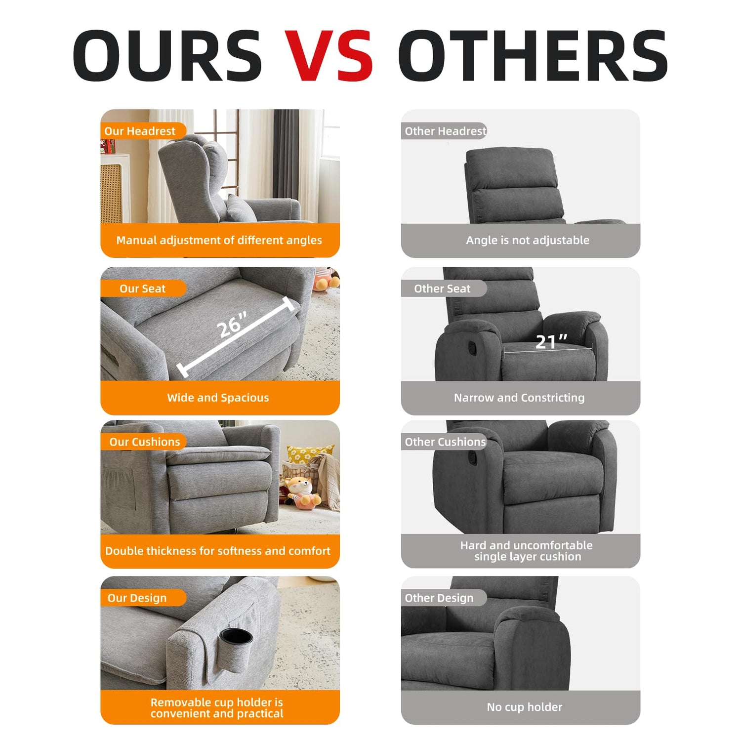 - 26" Extra Wide Seat: The 26" wider and larger seat is not only spacious and comfortable, but also suitable for a wide range of people, especially mothers and babies, as well as tall adults who can play and rest with their babies on the nursery recliner. The skin-friendly and comfortable chenille fabric and the stylish and beautiful design add a touch of sophistication to living rooms, bedrooms and nurseries.