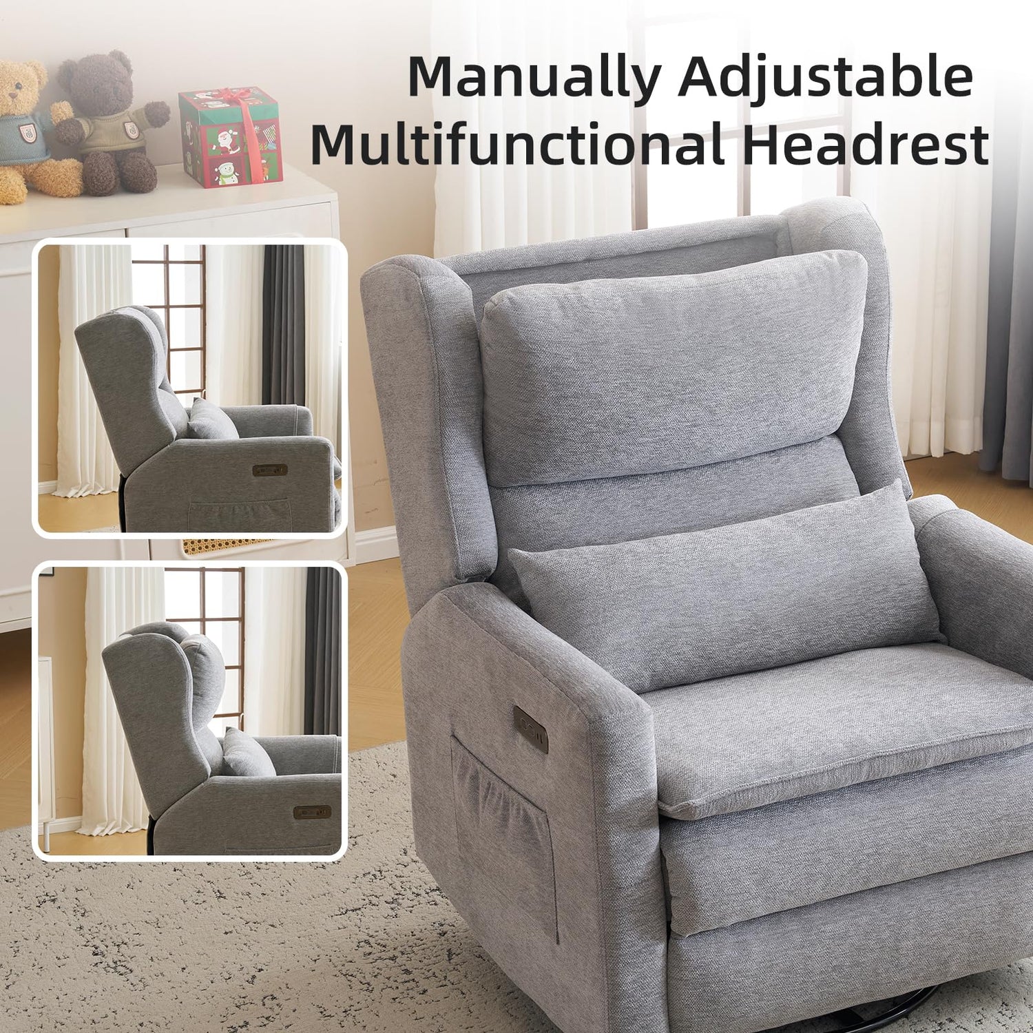 Rhevoy Oversized Swivel Rocker Recliner Chair, 26" Extra Wide Glider Nursery Chair with Adjustable Headrest, Chenille Power Recliner Rocking with Double Cushion, Cup Holder, Grey