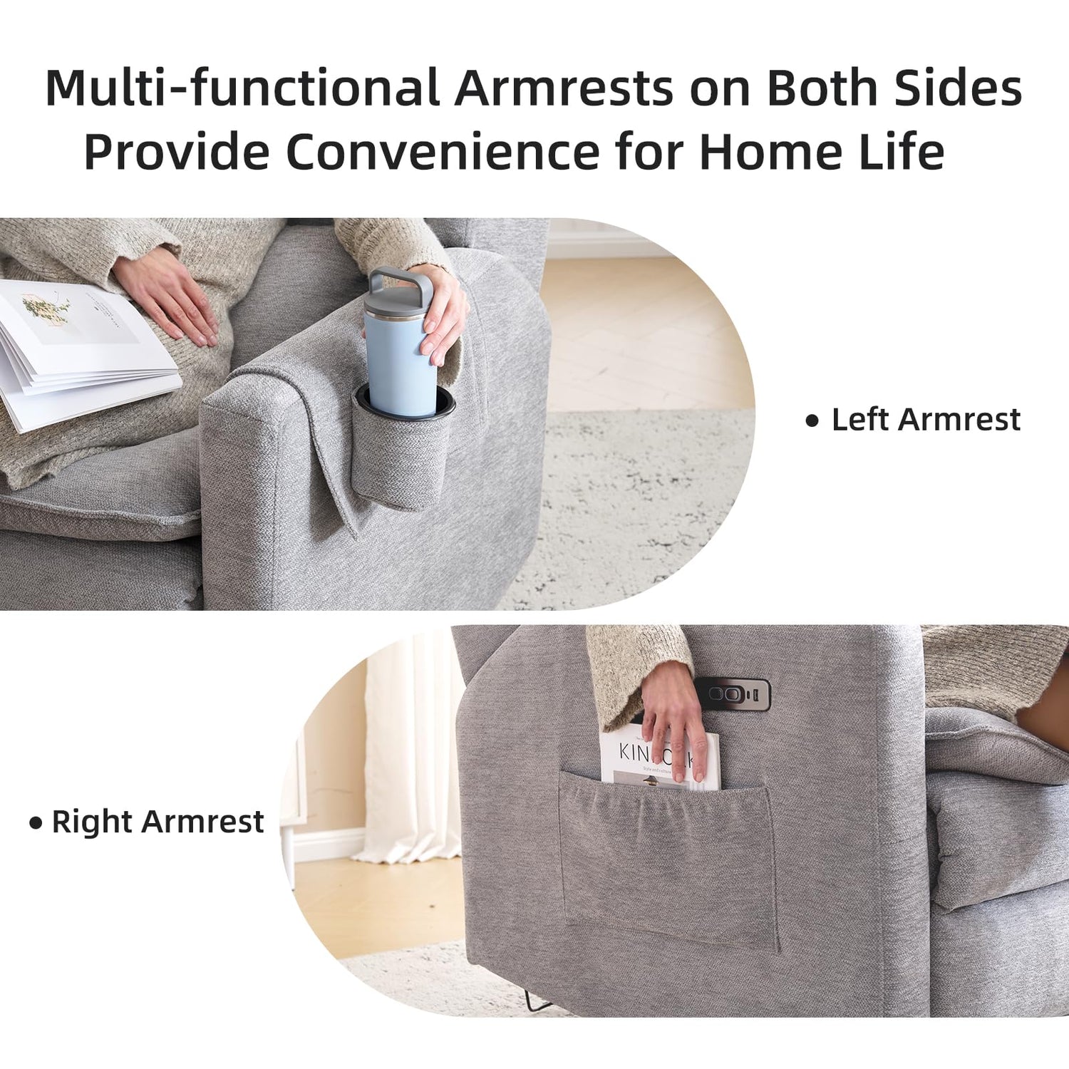 - Multifunctional Armrests: The left armrest of the glider recliner has a removable padded cushion and, as well as a cup holder, a mobile phone pocket and a tissue pocket. The right armrest has a USB and Type-C charging port and a side pocket that is not only convenient for charging but also ideal for storing books, magazines and baby essentials.