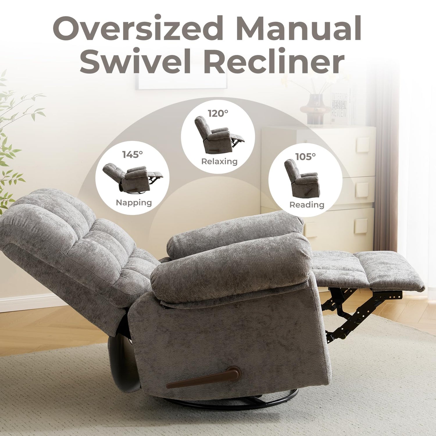 - Oversized Swivel Rocker Recliner: Our swivel recliner chair can swivel 270° freely and offers 30° gentle rocking function.The swivel glider rocking chair can adjust the backrest to 90°, 120°, or 145° through the side handle. You only need to pull the handle to tilt and stretch your body. Whether you are sitting or lying flat, this glider rocking chair can help you relieve stress and fatigue, providing ultimate comfort and enjoyment for your daily life.