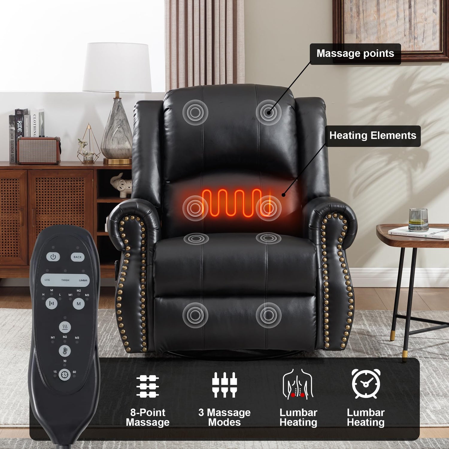 - MASSAGE AND LUMBAR HEAT FUNCTIONS: The living room chairs come with 8 massage points and lumbar heating let your neck, back, hips, and thighs get relaxed and your lumbar get warmed. You can set different intensities and times through the remote control to massage key parts of the body. Effectively relieves fatigue and stress, and allows you to enjoy deep relaxation after a busy day
