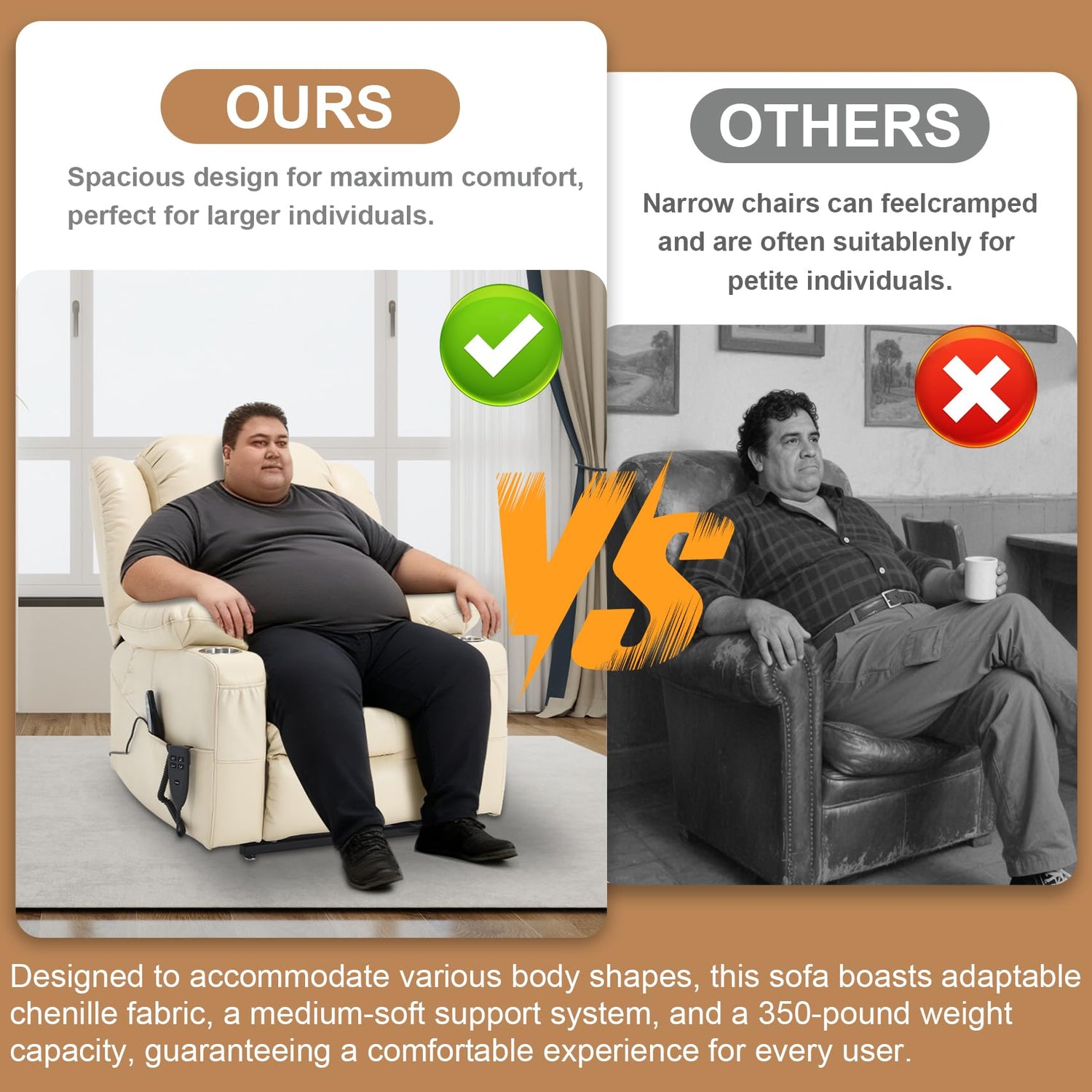 - 【Power Lift Massage Recliner with Heating】 This electric lift recliner is designed for relaxation and support, featuring an extra-wide 23-inch seat and 33-inch backrest to accommodate larger individuals with ease. With a robust 350-pound weight capacity, it ensures stability and durability for long-term use. The thickened, ergonomic cushioning provides exceptional thigh and lumbar support, maintaining comfort whether sitting or reclining for extended periods.