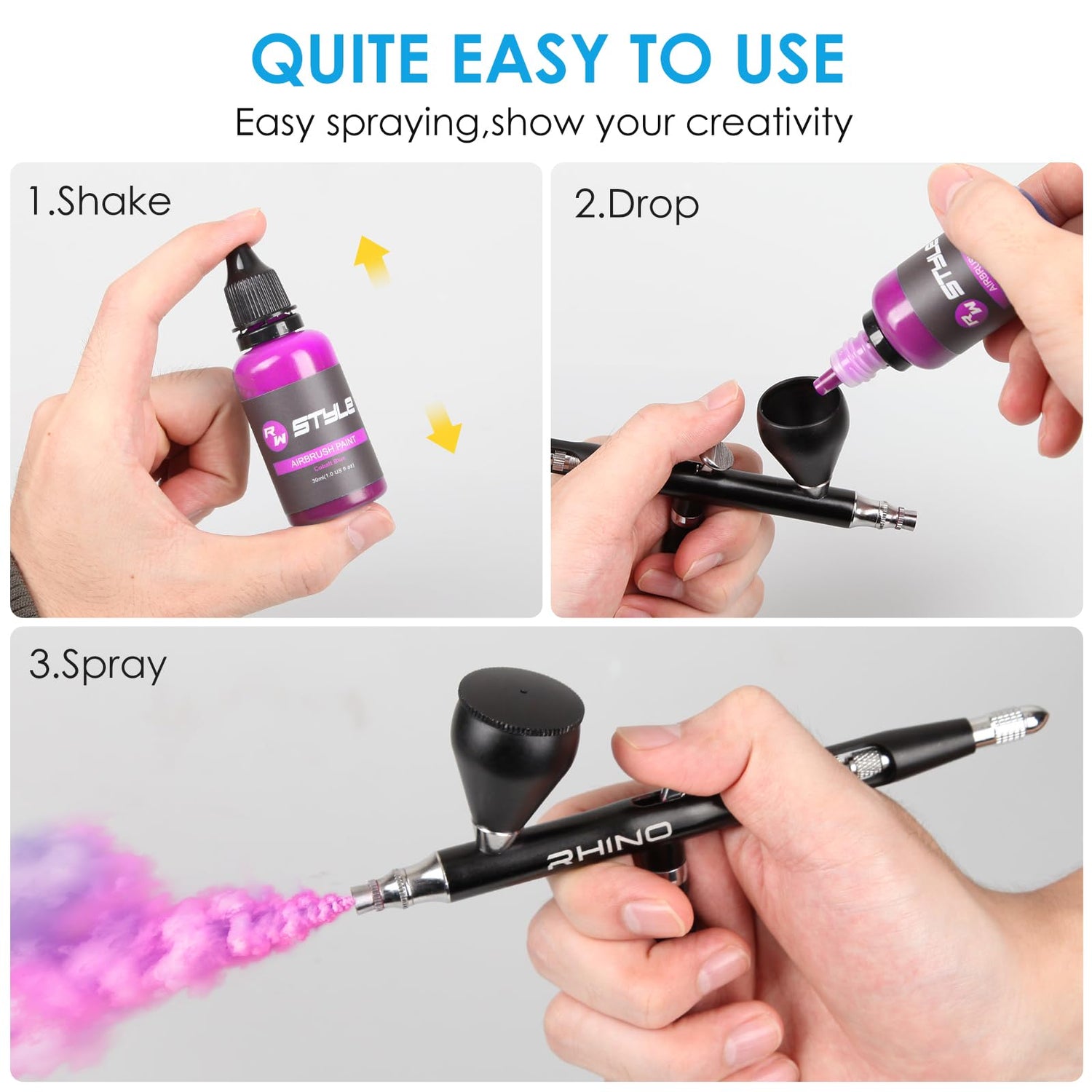 - đ¨ăAirbrush Paint Starter KităRhinowisdom's airbrush paint kit has 48 vivid colors: 24 classic opaque colors, 24 Brilliant colors. 30ml/bottle with capacity, Lightweight and convenient to carry, you can make as many DIY as you want. Perfect as a starter airbrush kit, totally satisfying your painting needs without a mixing process.