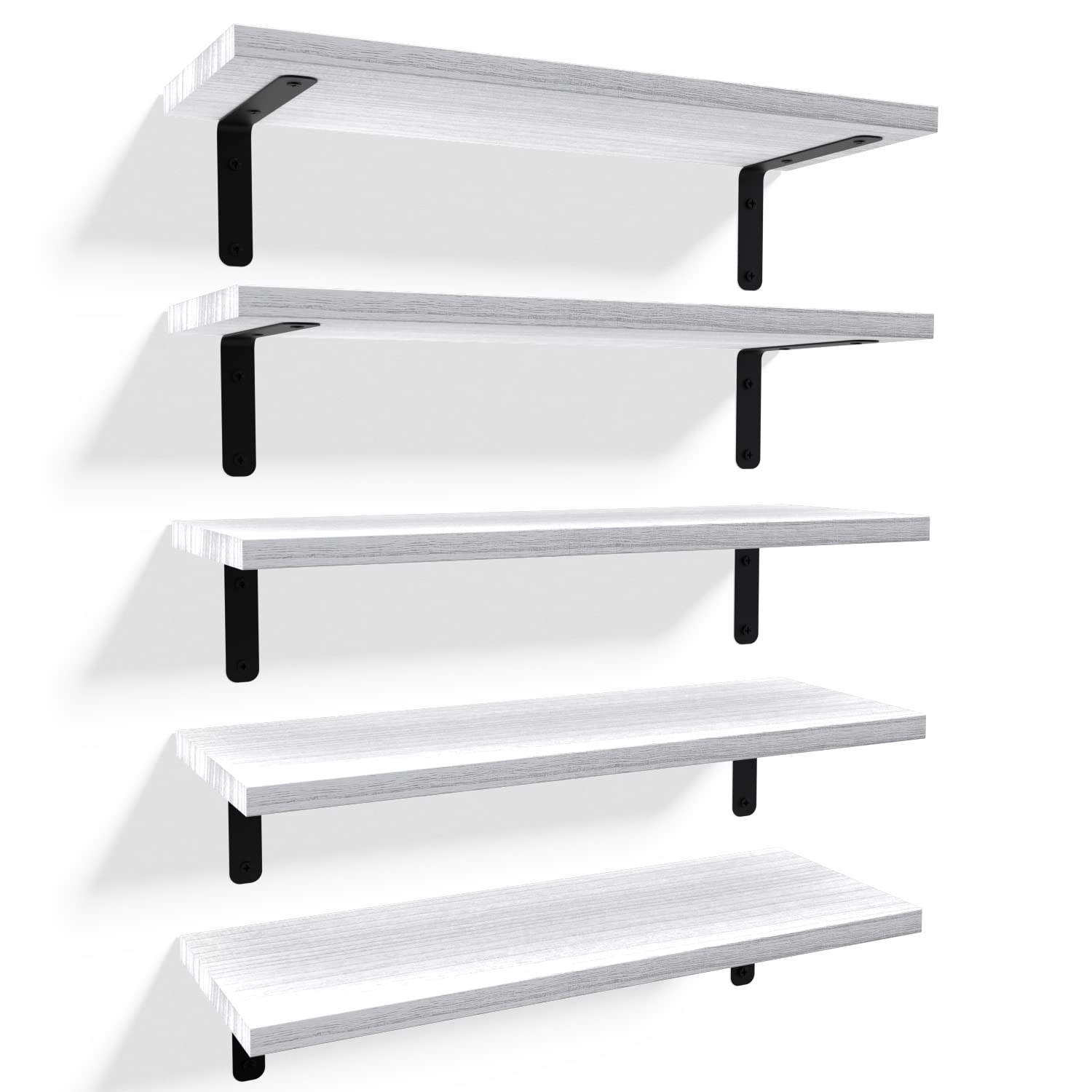 RICHER HOUSE Floating Wall Shelves, Rustic Wood Bathroom Shelves Set of 5, Farmhouse Style Shelf for Décor, Hanging Bedroom, Storage, Kitchen, Living Room - White