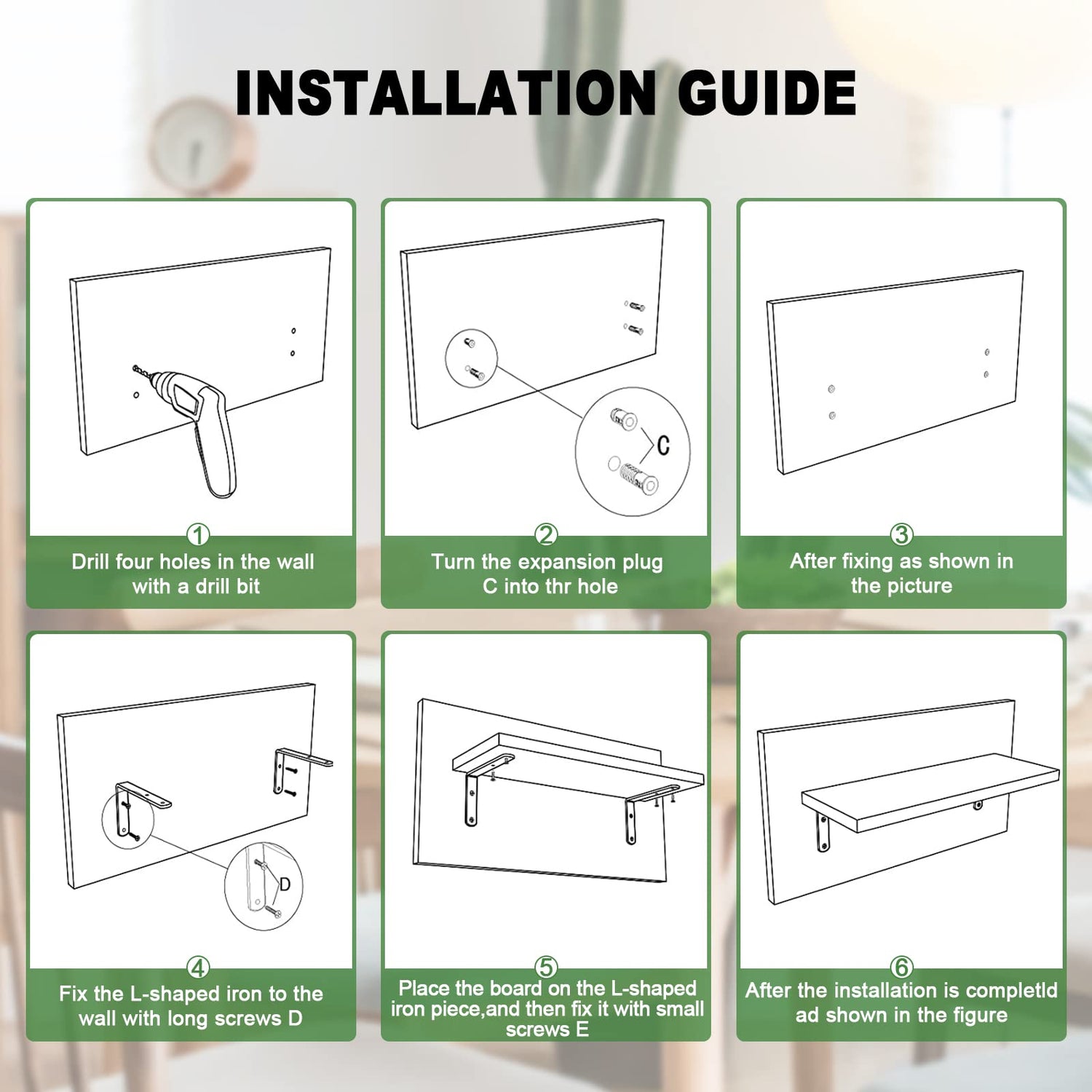 Details: RICHER HOUSE Modern/Rustic Floating Shelves for Bedroom 5 Sets: Natural Wood (Solid Paulownia Wood) Modern/Rustic Design Carbonized Color Kitchen/Bedroom/Cabinet/Bathroom/Living Room Wall Shelves Specifications: Full Size Shelves: 16.5"L×6"W×0.6"H (SET of 5). Max Weight Capacity: 40 lb. Package Includes: 16.5"L×6"W×0.6"H Shelf Board x 5 ** (No pre-drilled holes)** 5"×3" Shelf Bracket x 10 Wall Screw x 21 Plastic Screw Anchor for Drywall x 21 Plastic Screw Anchor for Other Wall x 21 Wood Screw × 21 Manual x 1 Tools required: Drill Screwdriver