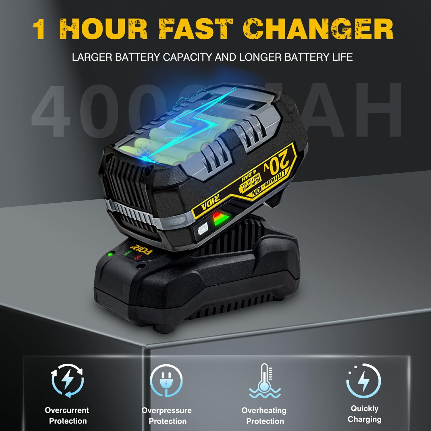 - 【4000mAh BATTERY & 1 Hour FAST CHARGER】 If you have a RIDA Impact Wrench , You can get a better DIY experience. The built-in LED illuminates your dark working environment, and the belt clips make it easier to carry around, Release your hands. 20V 4.0Ah large capacity rechargeable lithium-ion battery with power indicator ,2.4A ultra fast charger enables constantly running, weighs only 3.5lbs. Such user-friendly designs make repair work so much easier for anyone!
