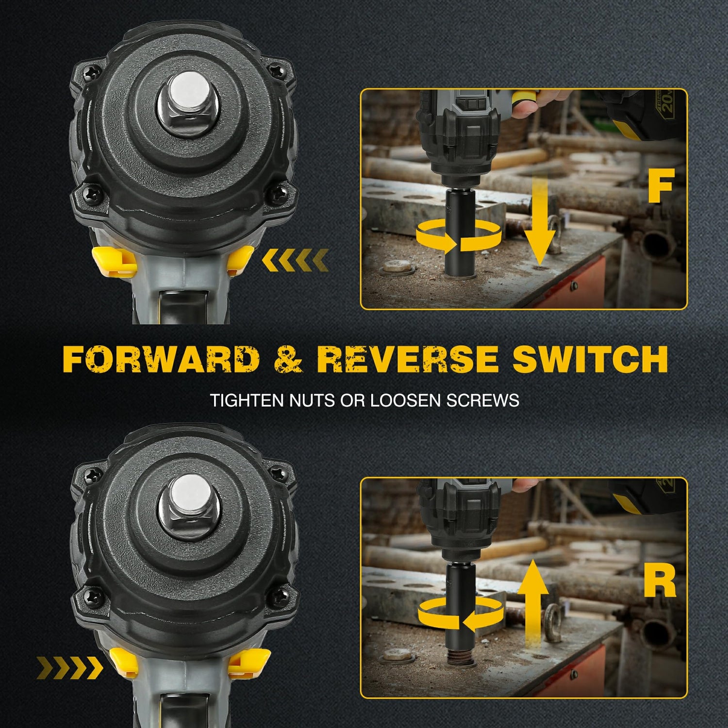 - 【5 Kind of Powerful Forces 】RIDA 1/2" square driver possess 5 torque options(100N.m / 150N.m / 200N.m / 300N.m / 400N.m) and 5 shock frequencies(2000BPM / 2350BPM / 2640BPM / 2780BPM / 3200 BPM), remove or tighten the nuts within seconds. The impact wrench provides maximum productivity when tightening or removing nuts, is a powerful all-round helper for matching your desires, perfect for professional and DIYers Build, repair and other everyday use.