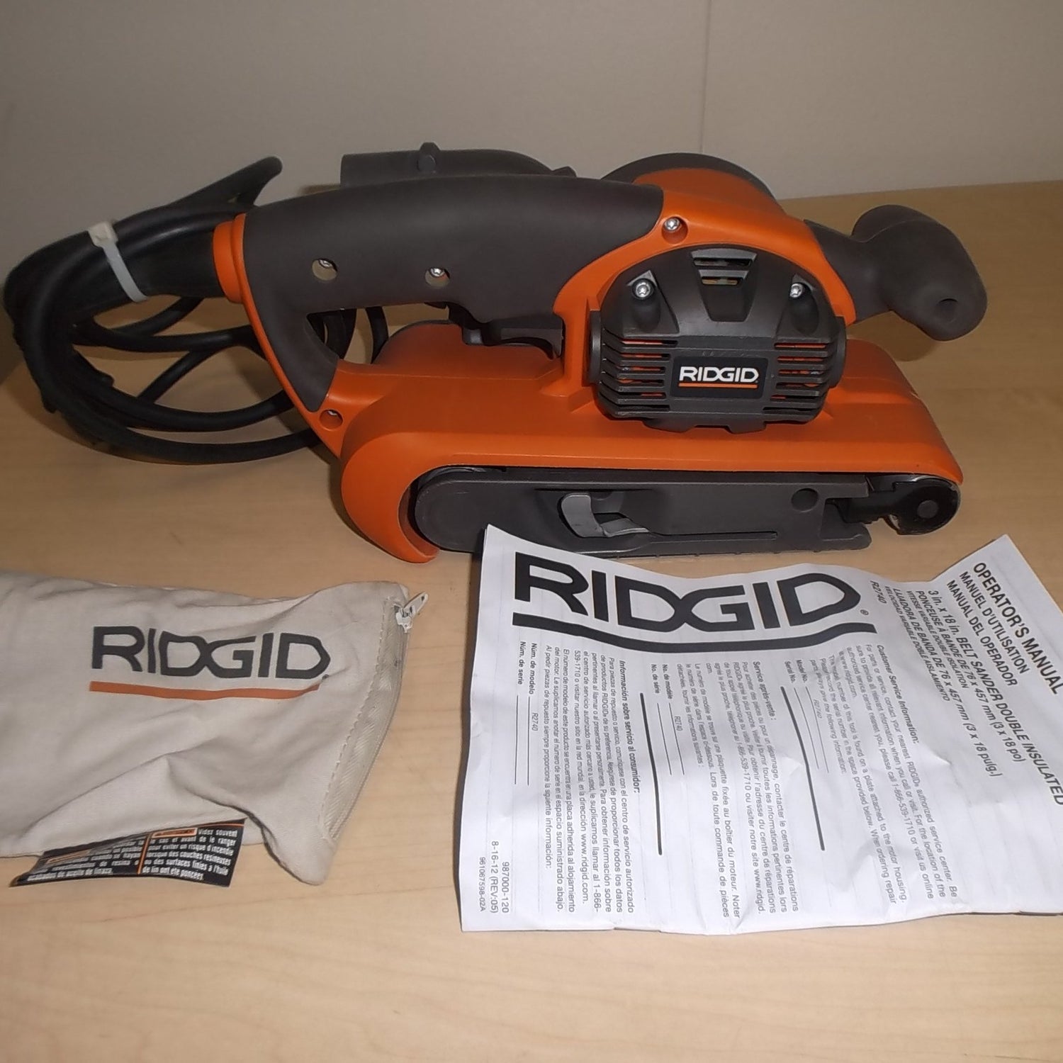 Ridgid R2740 Sander, 3-inch x 18-inch Belt has twin fan high efficiency dust collection while one fan cools the motor, the other collects dust resulting in maximum dust pickup efficiency. Soft Grip handles provide increased comfort and decreased vibration, while the 12-foot all rubber cord with cord wrap provides added durability and convenience. Automatic belt tracking automatically adjusts belt to center of platen for alignment. 6.5 amp motor is belt and gear driven for added power and durability. Variable speed dial with electronic feedback matches the speed to the desired removal rate. Electronic feedback helps maintain motor speed under load for consistent results. Flush sanding capability allows for flush sanding against vertical surfaces. Accessible brushes can be serviced quickly for minimum downtime. Tool-free belt release makes changing belts quick and easy. Lighted plug to easily identify live tools. Specifications: Input: 120 V AC, 6.5 Amps, Belt Size: 3 in. x 18 in., Belt Speed (SFPM) 400 - 950 (no load speed), Tool Weight: 5.8 lbs. Includes: R2740 Sander, dust bag 80G sanding belt, and operator's manual.