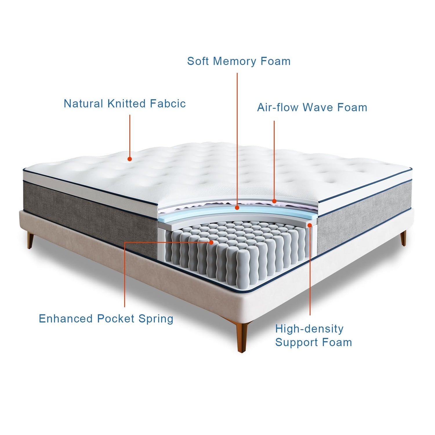 - 3.Motion Isolation-An innerspring base made up of hundreds of individual pocketed coils provides the right amount of support for each part of the body.Each spring coil responds to movement individually,helping to reduce motion transfer and noise from your partner