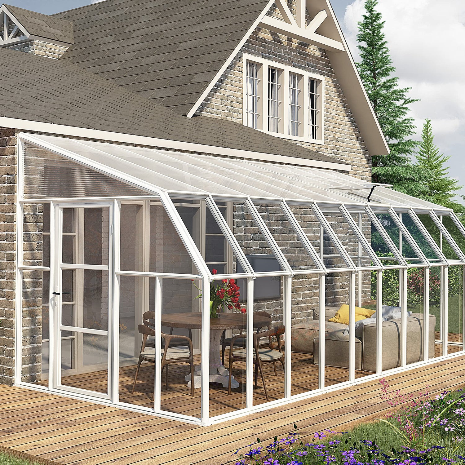 Discover the simplest way to turn your existing porch, deck or patio into a great sunroom enclosure or greenhouse space. The Sun Room 2 features two kinds of virtually unbreakable coverings to give you the best of both worlds. Roof panels are 4mm twin-wall polycarbonate, offering UV protection and diffuse light. Crystal clear acrylic side walls are 100% UV protected while allowing over 90% light transmission, as well as clear views, while being ultra-safe. Durable white resin frame improves insulation and is maintenance free for ease of use. Hinged door and included roof vent provide air circulation. Accessories and additional lengths available.