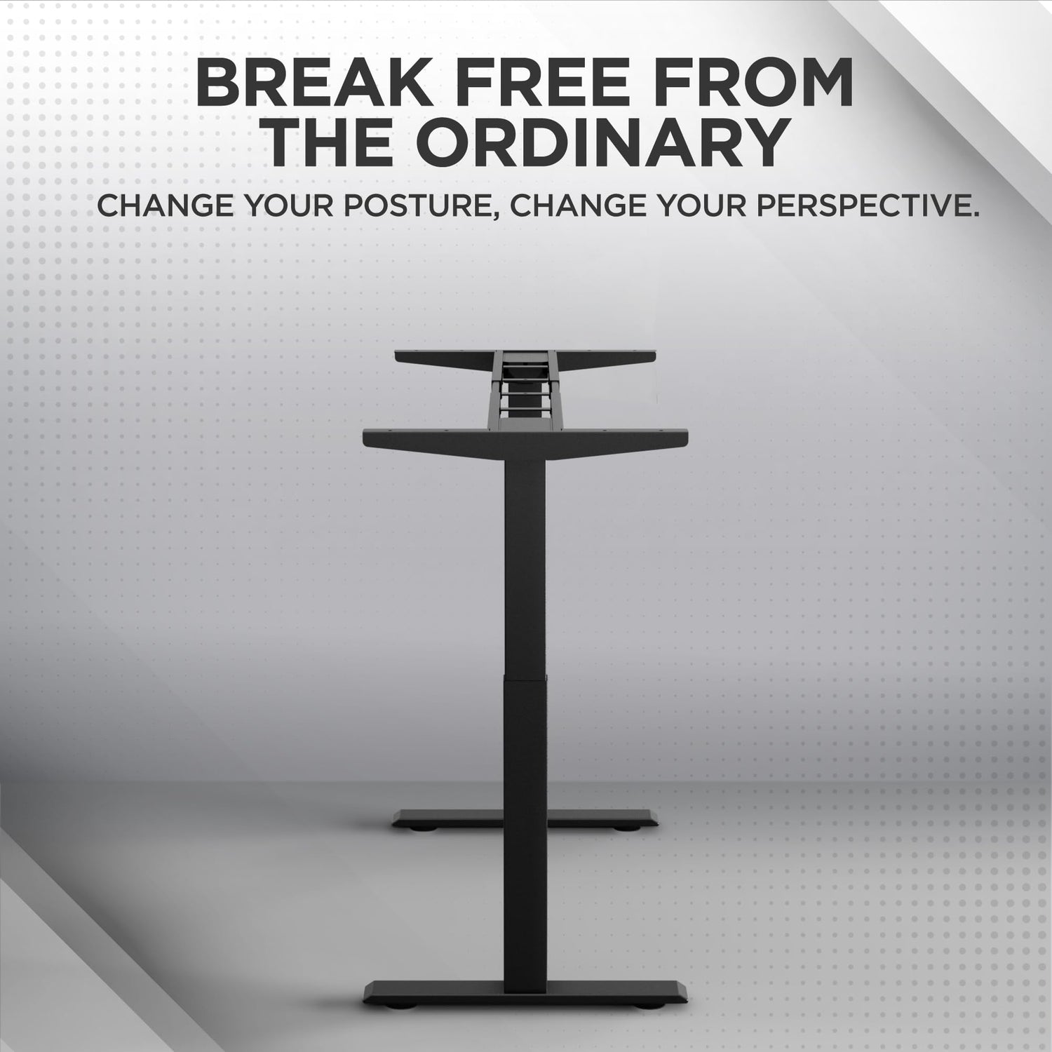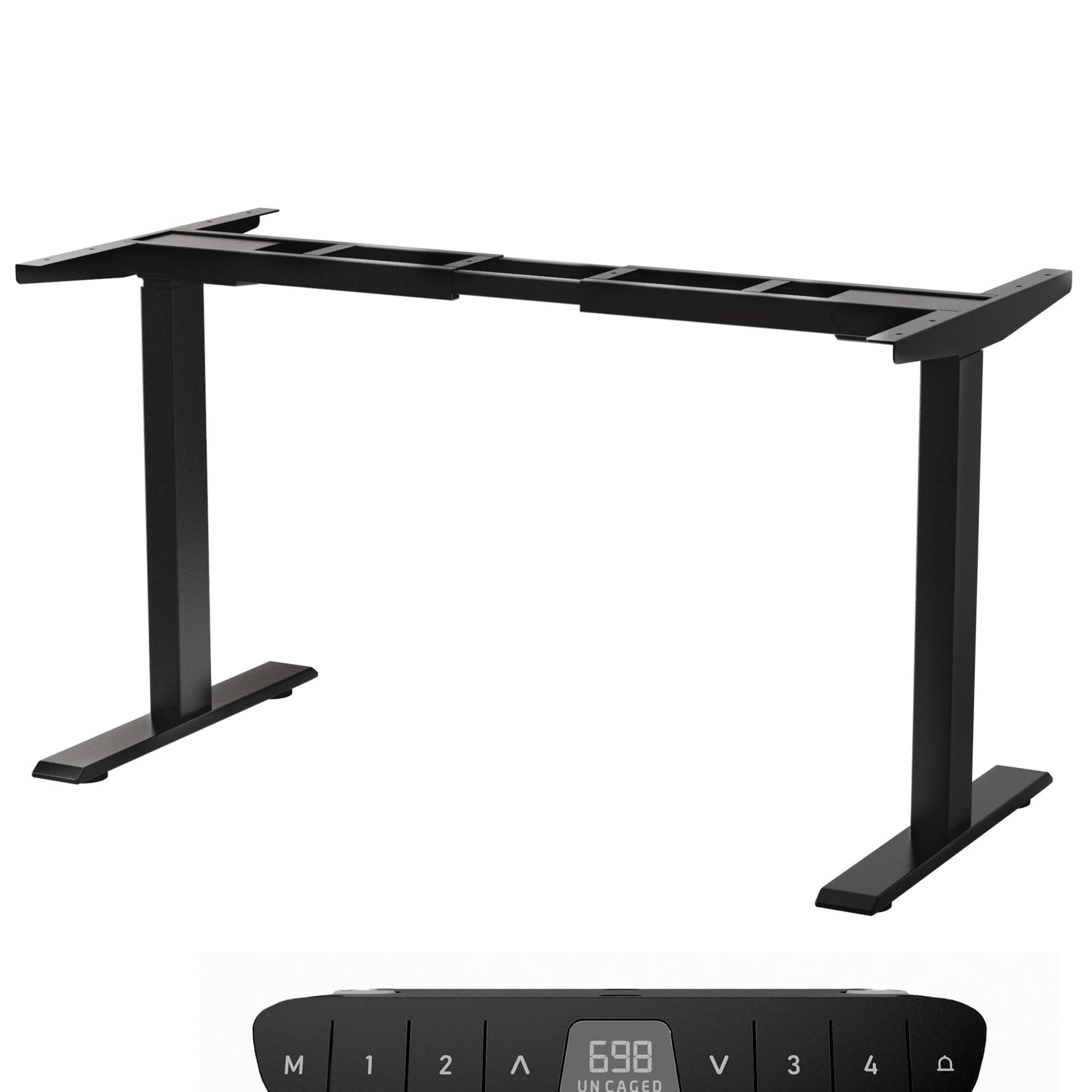 Details: Flow between sitting and standing with this premium, adjustable standing desk frame. Uncaged Ergonomics crafts every Rise Up stand up desk frame with all the features you need to create a long-lasting ergonomic work from home desk or ergonomic office desk. The precision, laser-cut steel computer desk legs has 2 “best in class” motors with over a decade of proven durability, easily programmable memory settings for 1-touch adjustments, and is adjustable in width to accommodate your unique space and desktop size. Quickly move from sitting to standing with this durable, purpose-built height adjustable desk legs. Special features of the Rise Up Electric Standing Desk Frame with Dual Motors, Memory * Adjustable Height (27.2-46.7"). Tall adjustable height range properly fits almost everyone * Adjustable Width (42.3-60”). Holds a range of desktop sizes * 2 Motors (1 in each leg) for a fast, smooth, even height adjustment * 2-stage legs (more height range and heavier load capacity) * Anti-Collision Technology helps prevent lowering the adjustable legs for desk on top of an object CONTROL PANEL: * Automatic Up/Down Adjustment * 4 Memory Settings (for 1-touch adjusting) * LED Height Readout Screen No desktop is included with this electric desk legs. Uncaged Ergonomics has been manufacturing this premium standing desk legs only for almost a decade. You’re purchasing from a company with a proven track record that’s continually worked to advance the features of the Rise Up adjustable height desk frame. We believe the motors are the key component of any rising desk frame and use industry-leading dual-motor technology to ensure a fast, smooth, even, efficient height adjustment. The quality of our rising desk legs is apparent from the minute you open the “fedex-resistant” packaging. Bring your own desktop and enjoy the freedom to sit, stand and move with our ergonomic adjustable electric frame motorized table legs! Height adjustable standing desk frame - standing frame