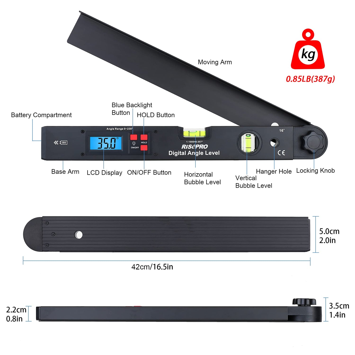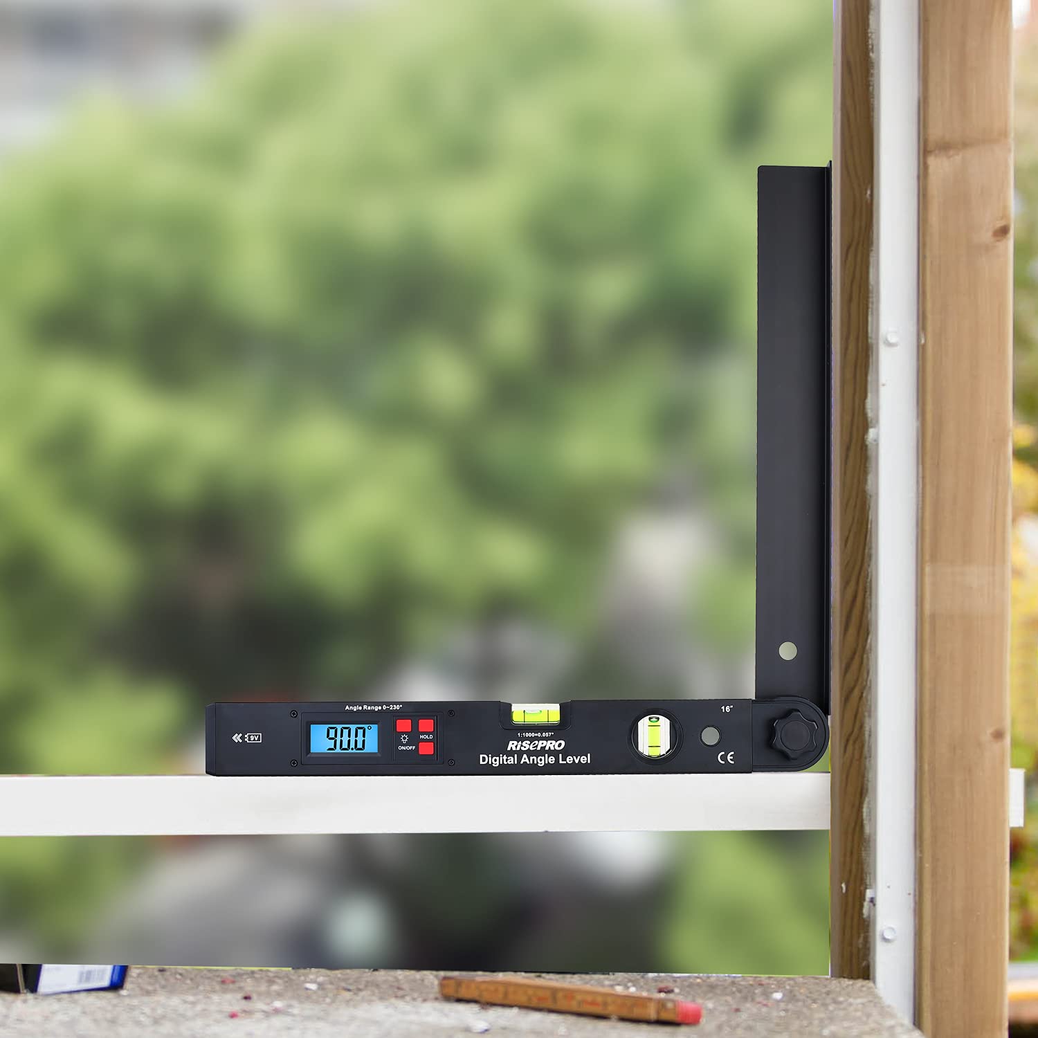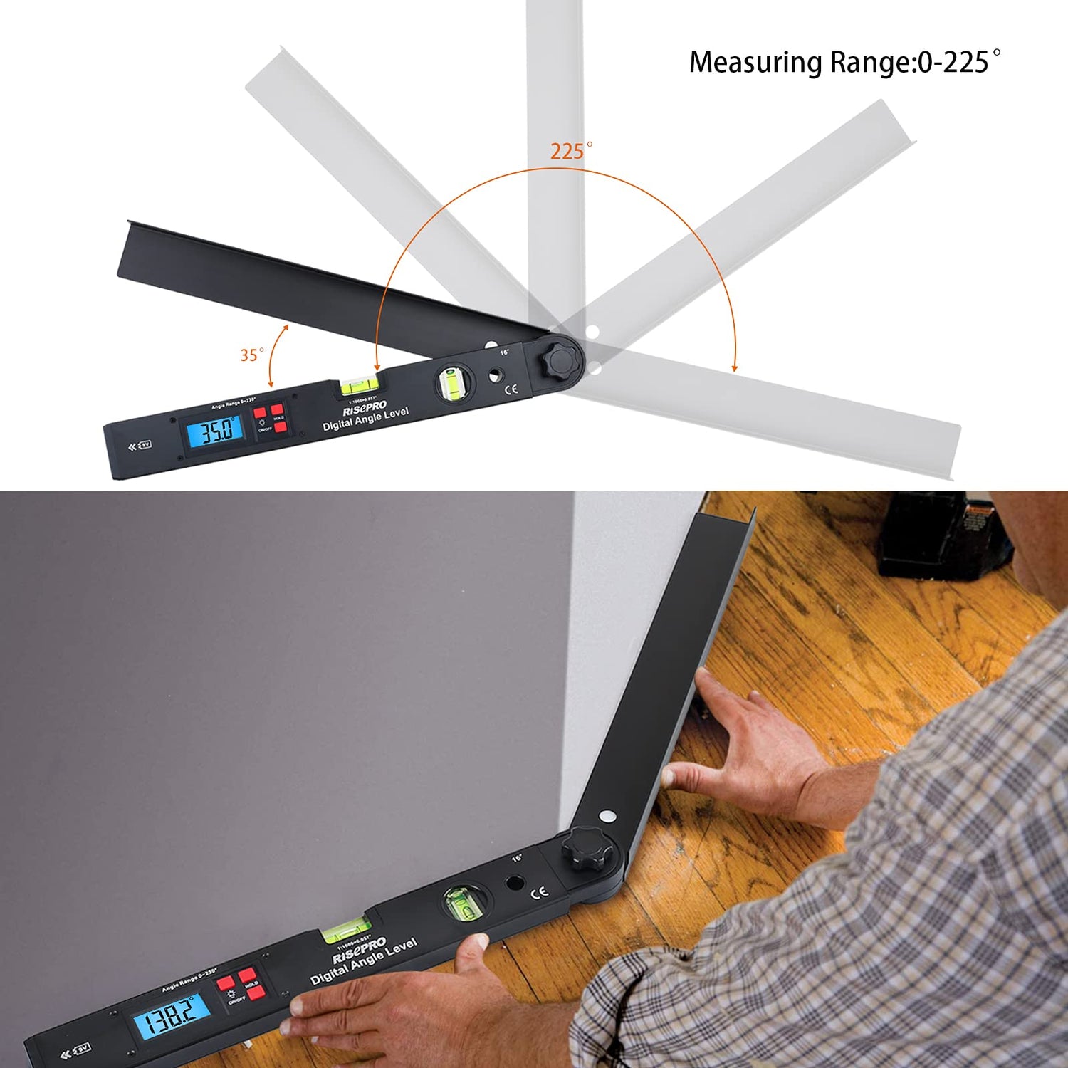 RISEPRO Aluminum Digital Angle Finder Protractor 0-225° 16 Inch Backlit LCD Digital with Horizontal and Vertical Bubble