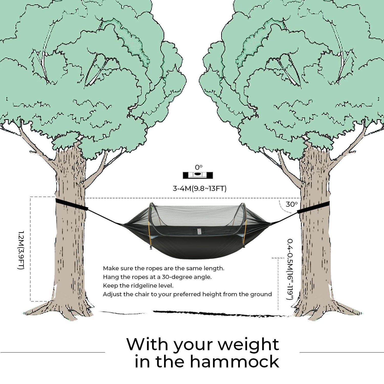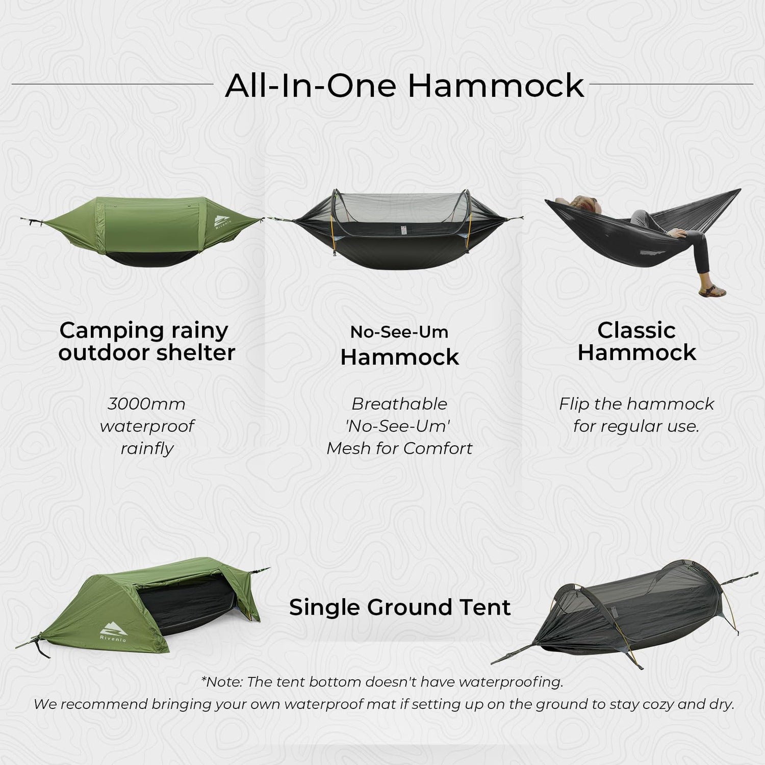 - 3 in 1 Function Hammock - The Camping Hammock tent is multi-functional to be used as a hammock; Rotate the hammock, It can be used as an ordinary tree hammock; When using with the rain fly, the hammock becomes a heavy rain waterproof tent with nice air flow.