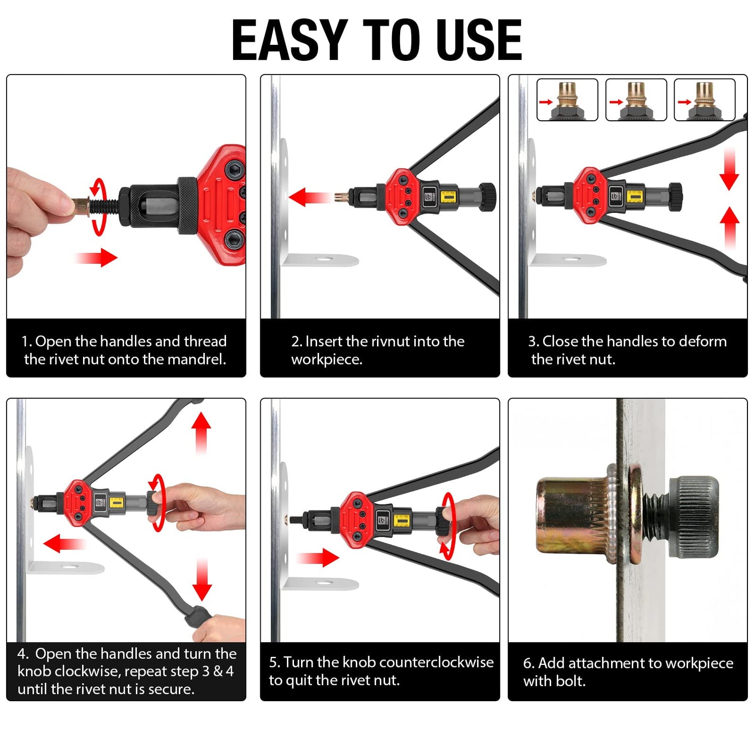 - ORGANIZED STORAGE SOLUTION - A rivnut tool, 12 interchangable mandrels including M3 M4 M5 M6 M8 M10 M12 10-24 1/4-20 3/8-16 5/16-18 1/2-13, 176pcs rivnuts, a spanner, a storage case keep all rivet nuts, a detailed user manual, and a rugged carrying case to keep all of them organized.