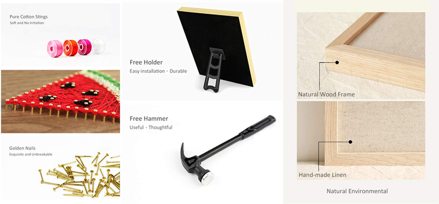 Whole set inculded: Instruction Manual, Hammer, Nails, Holder, 3M Glue & Screws, Cotton Strings, Wooden Frame and Pattern.