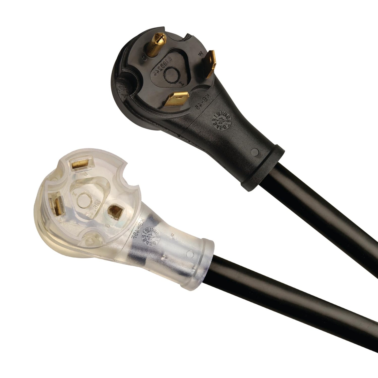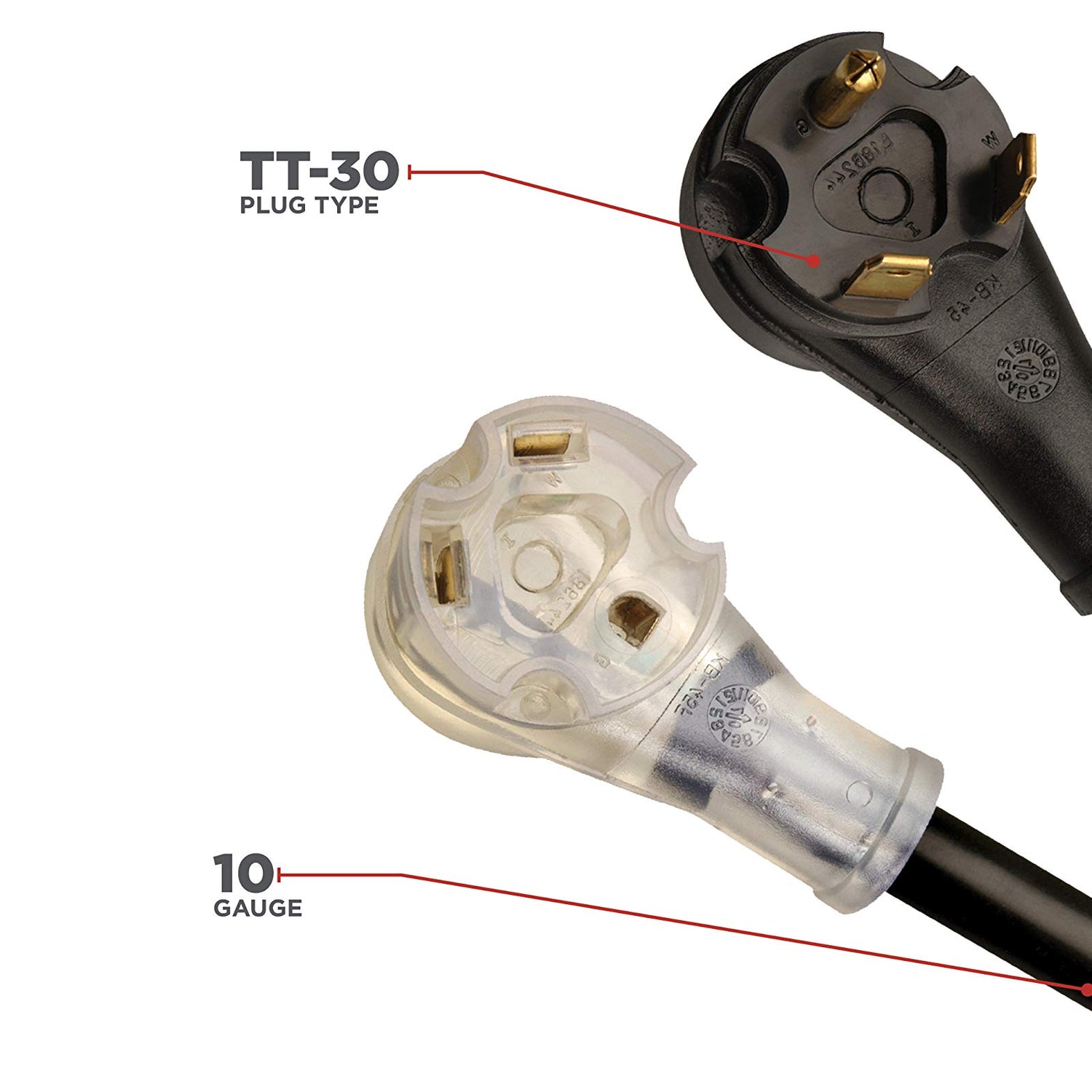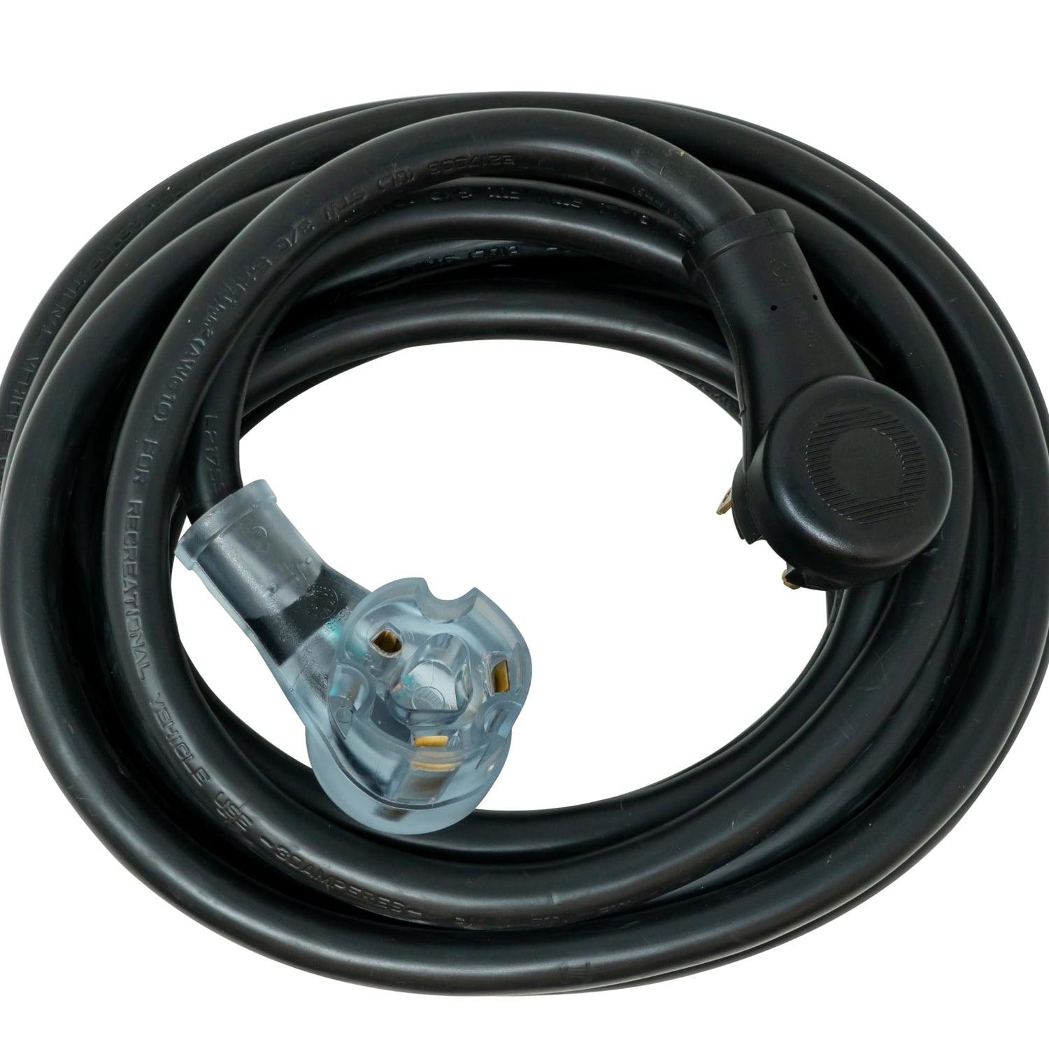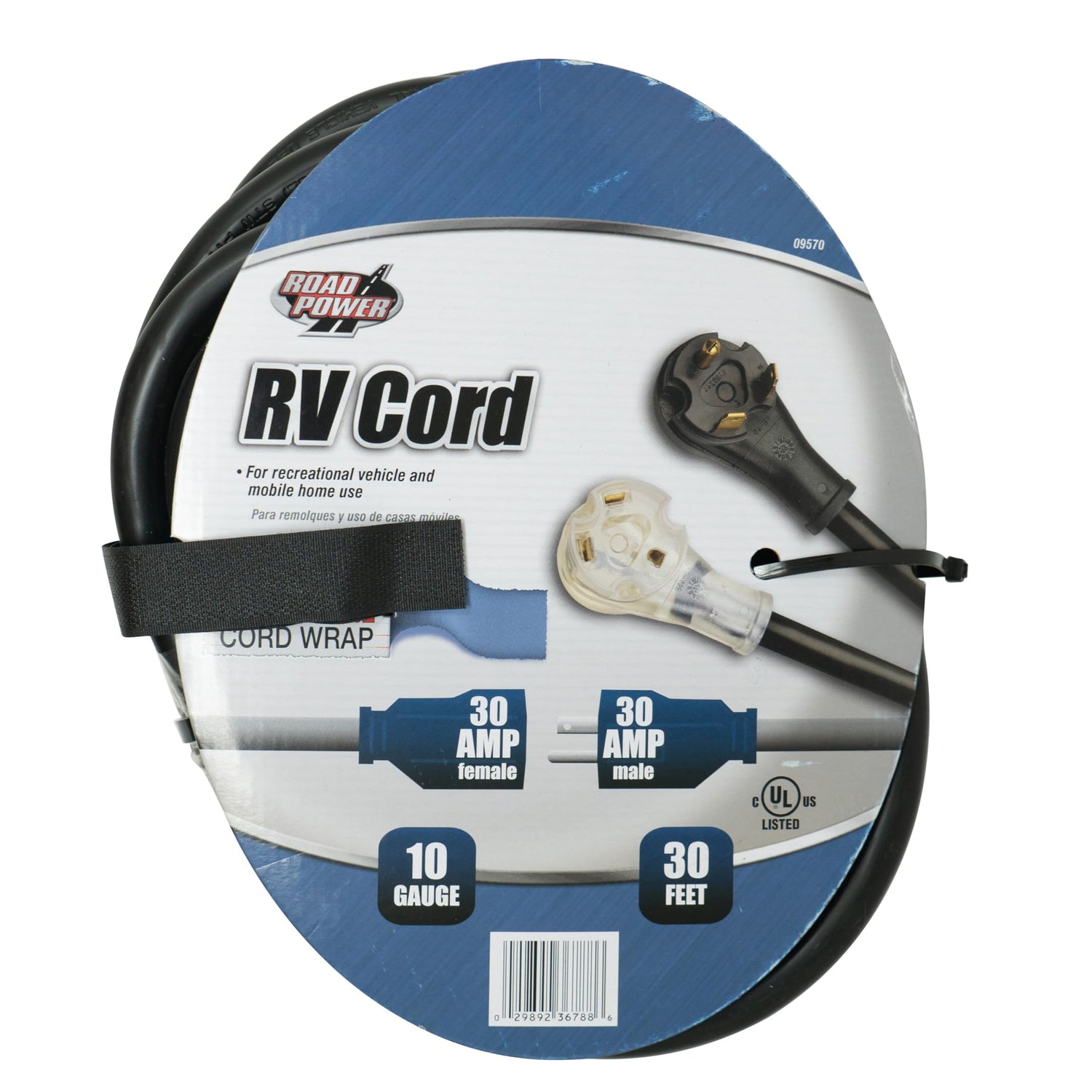 Details: Road Power 95707508 10/3-Gauge 30 Amp RV Extension Cord; Black; 30-Foot. 10/3 AWG STW extension cord for use with RVs . Extension cord is weather; chemical; moisture and abrasion resistant. Features power indicator light on clear female end; lets you know "Where the Power Is". 30-feet of cord allows flexibility for use in campgrounds and motor parks. Suitable for mobile homes and recreational areas; UL & cUL Listed. Easy to install and replace. For use in campgrounds; motor parks and recreational areas.