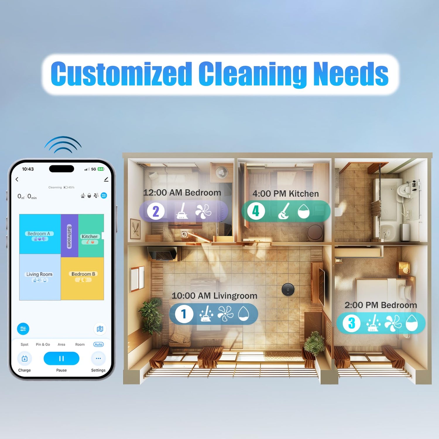 - 【2 in 1 Vacuuming & Mopping】 Robot vacuum cleaner integrates vacuuming, mopping and intelligent navigation, supports 4 levels of suction and 3 levels of water volume adjustment to meet different floor cleaning needs. Especially for areas with complex terrain, you can add restricted area settings through App application to achieve personalized cleaning solutions and enjoy a convenient and worry-free cleaning experience.
