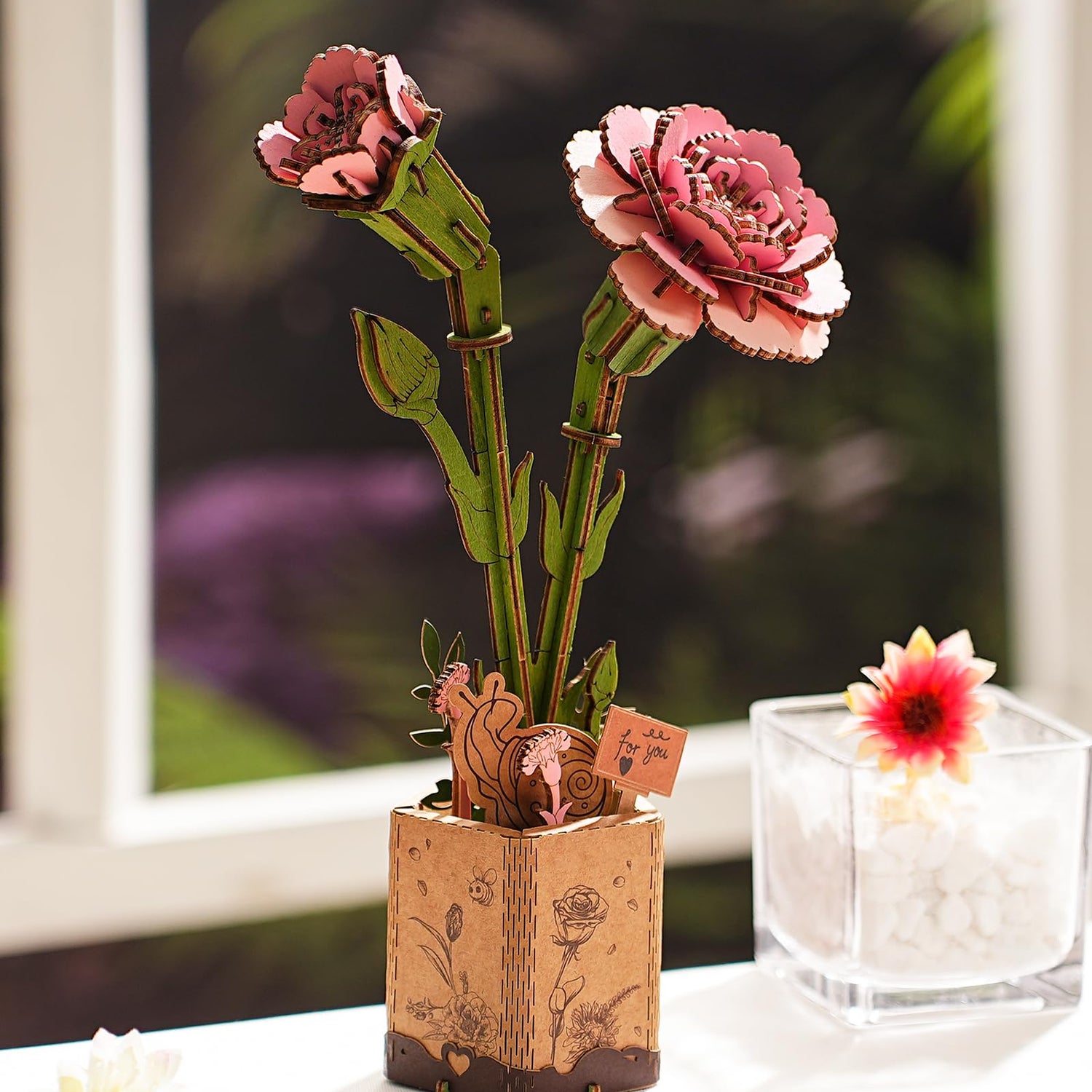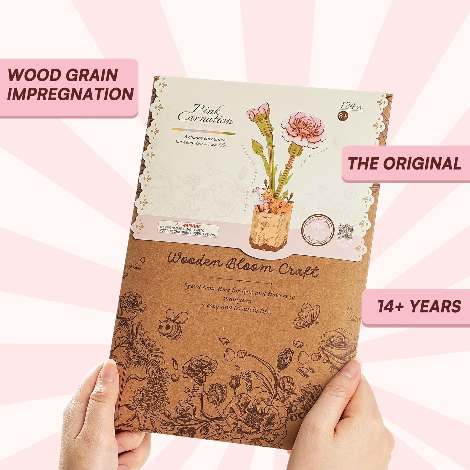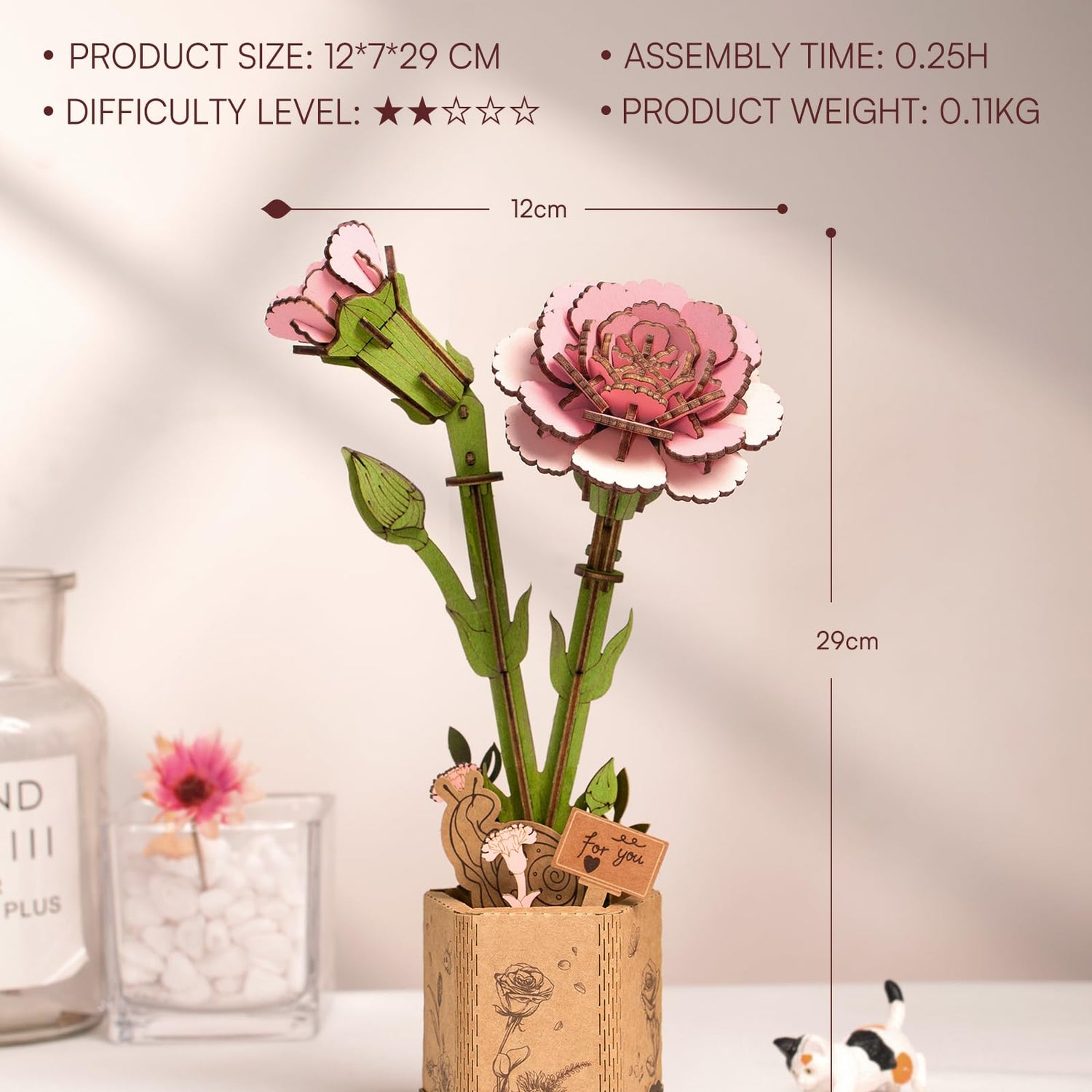 - 【ROBOTIME Model Flower Kit】Our Timeless Wooden Pink Carnation, with its exquisite details and pre-colored petals, radiates vibrant, lasting beauty in any room. Symbolizing enduring love and joy, these flowers never wilt, making them a perfect keepsake.