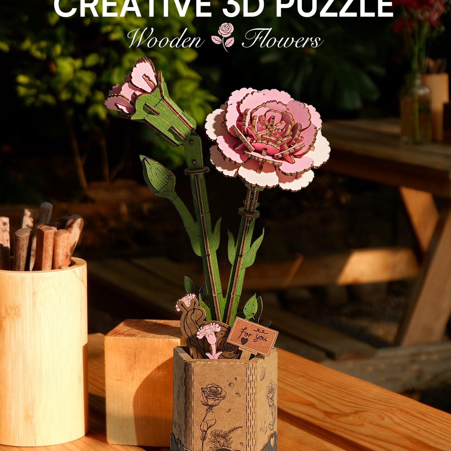 ROBOTIME 3D Puzzle Wooden Flower Pink Carnation DIY Model Kit to Build for Adults Artifical Bouquet Collection Craft Brain Teaser Puzzle Creative Gift Home Decor