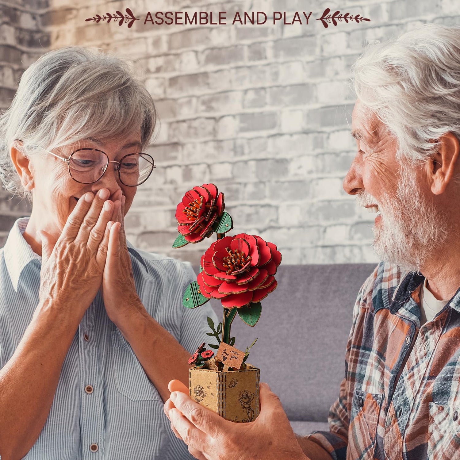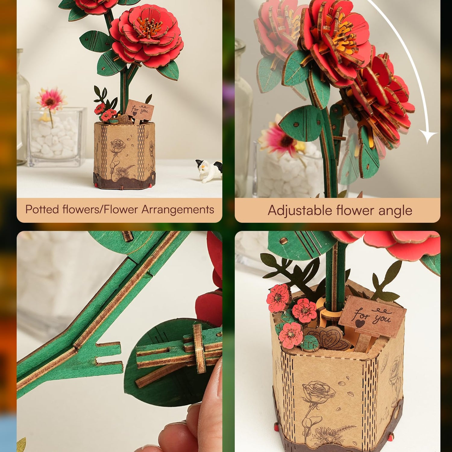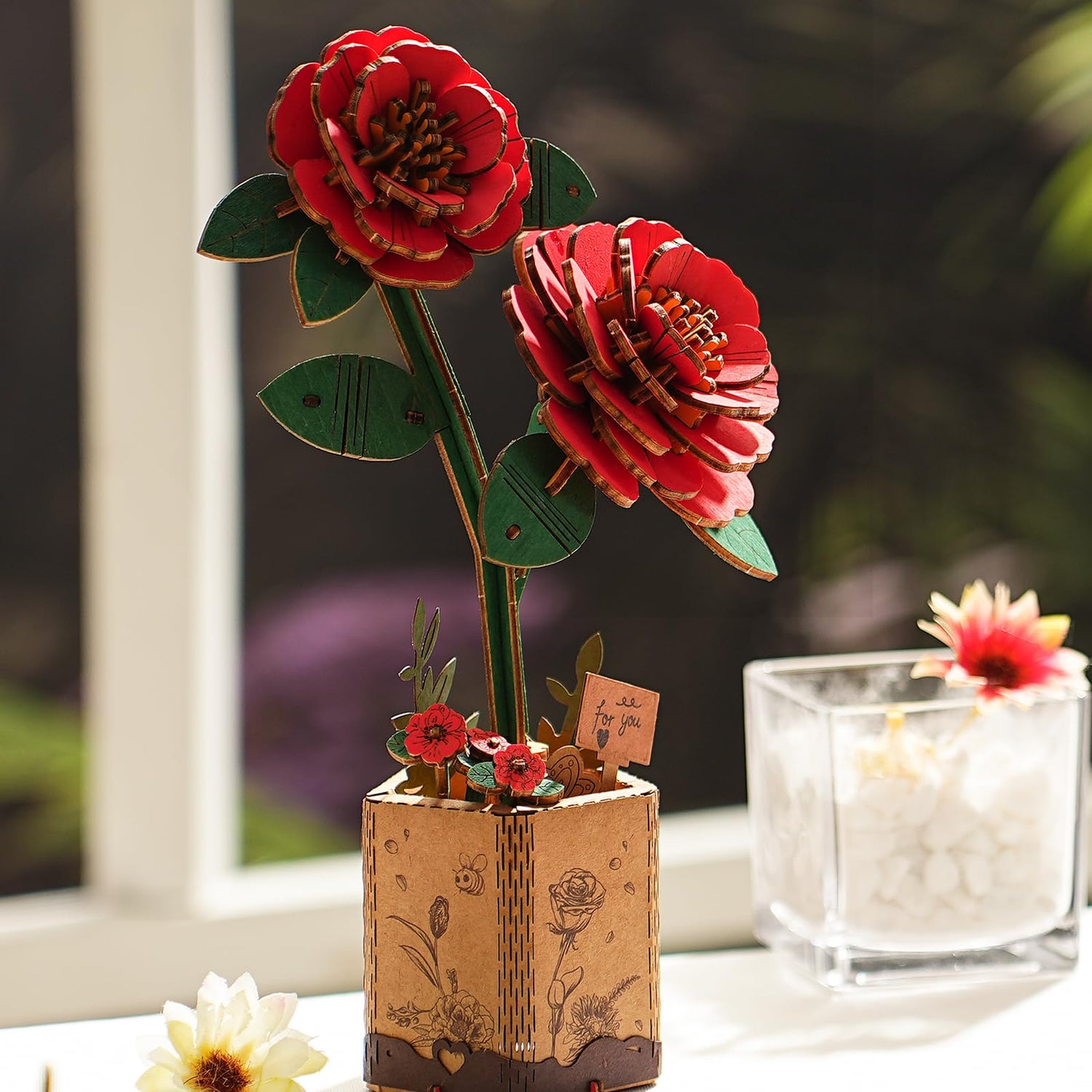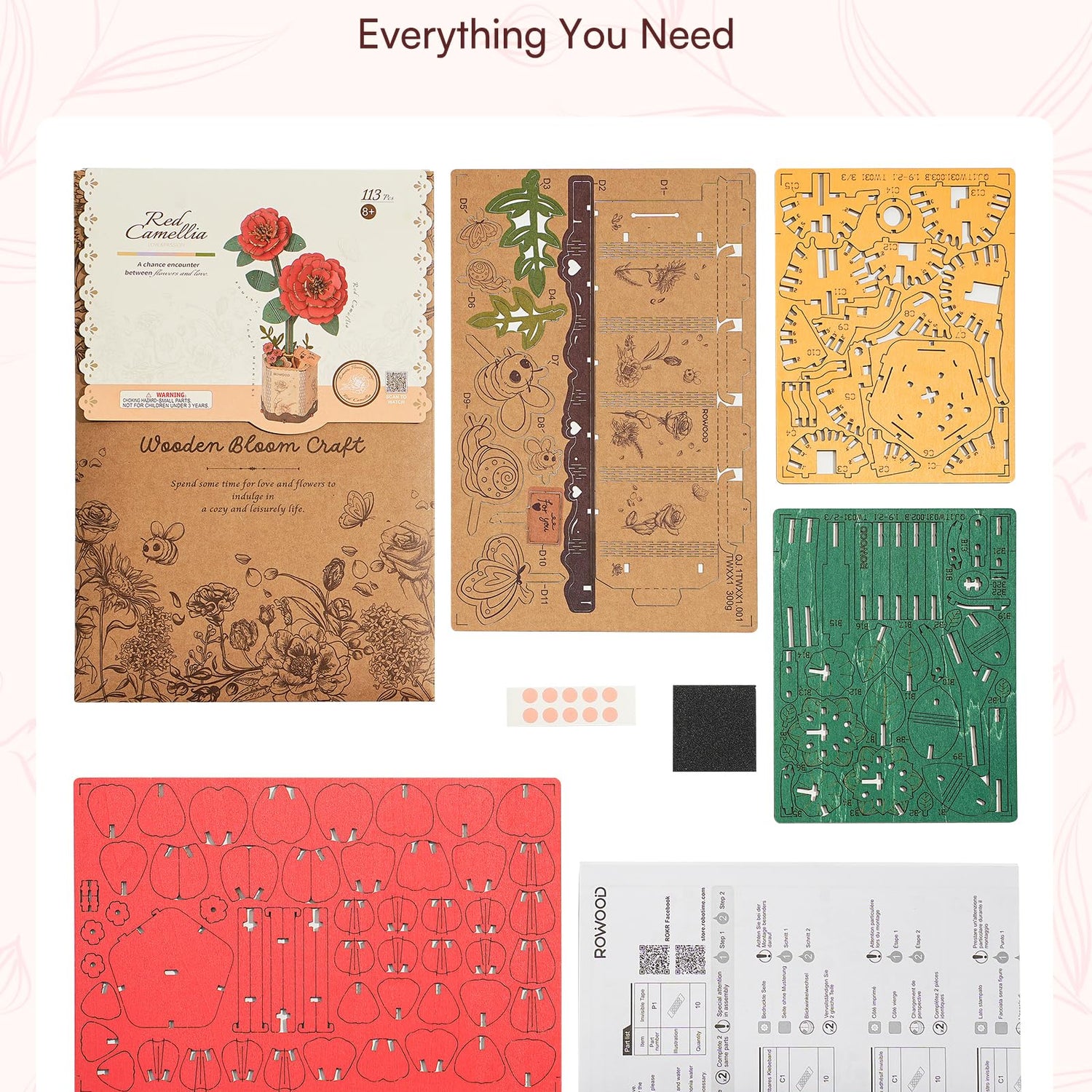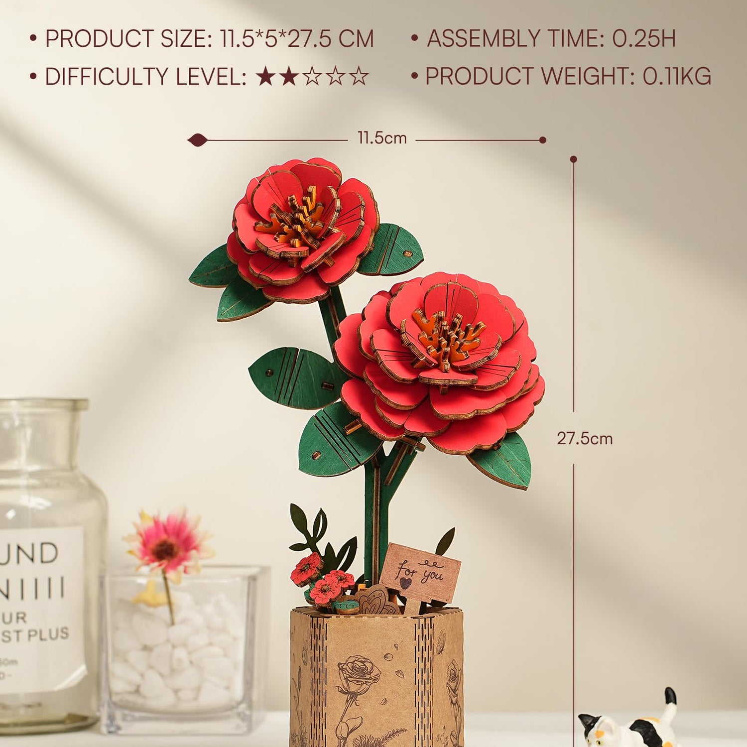 - 【ROBOTIME Model Flower Kit】Our Timeless Wooden Red Camellia, with its exquisite details and pre-colored petals, radiates vibrant, lasting beauty in any room. Symbolizing enduring love and joy, these flowers never wilt, making them a perfect keepsake.