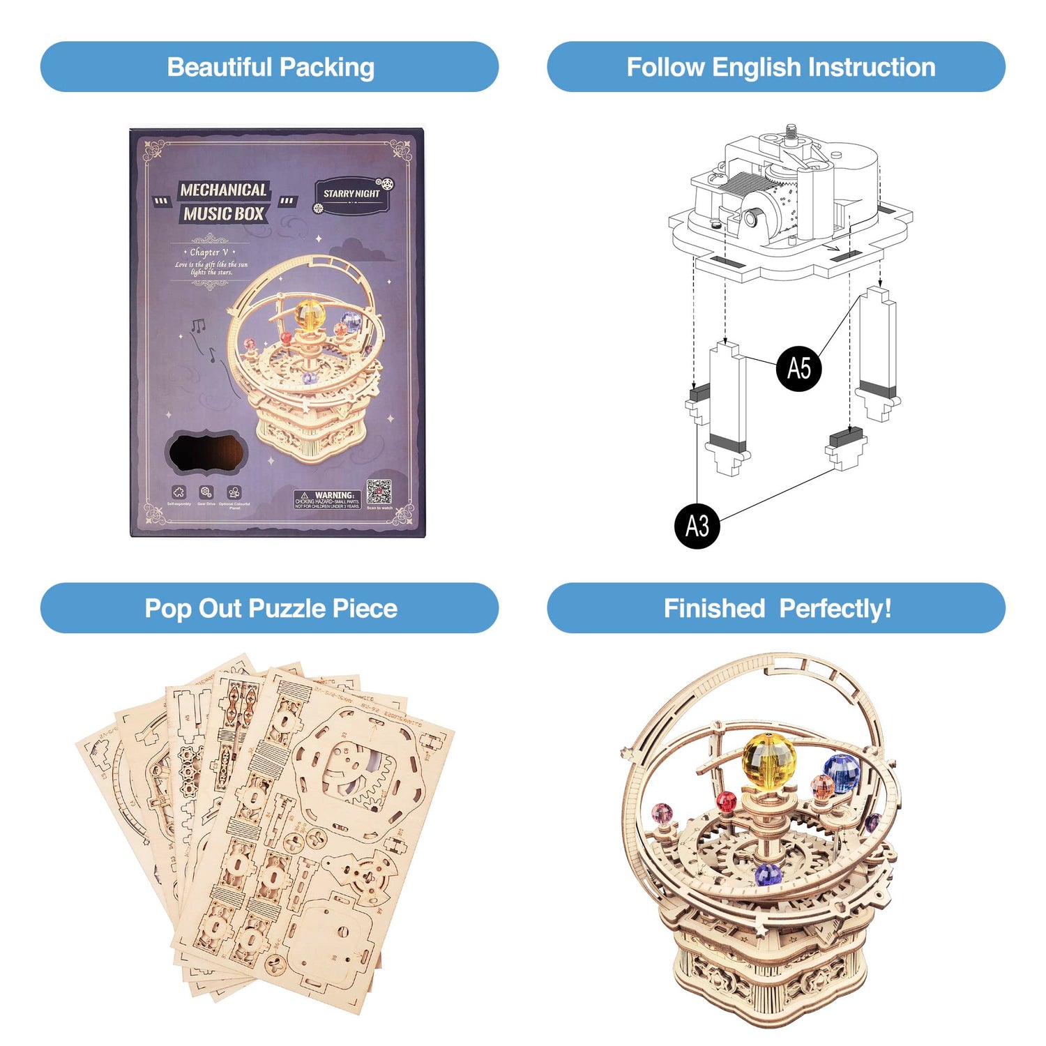 ROBOTIME 3D Puzzles for Adults Model Kits for Adults Hobbies for Men/Women Rotating Starry Night Wooden Puzzle Music Box AMK51