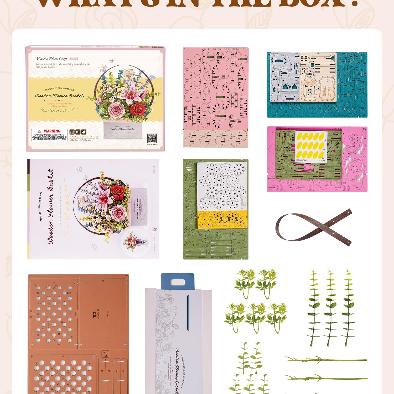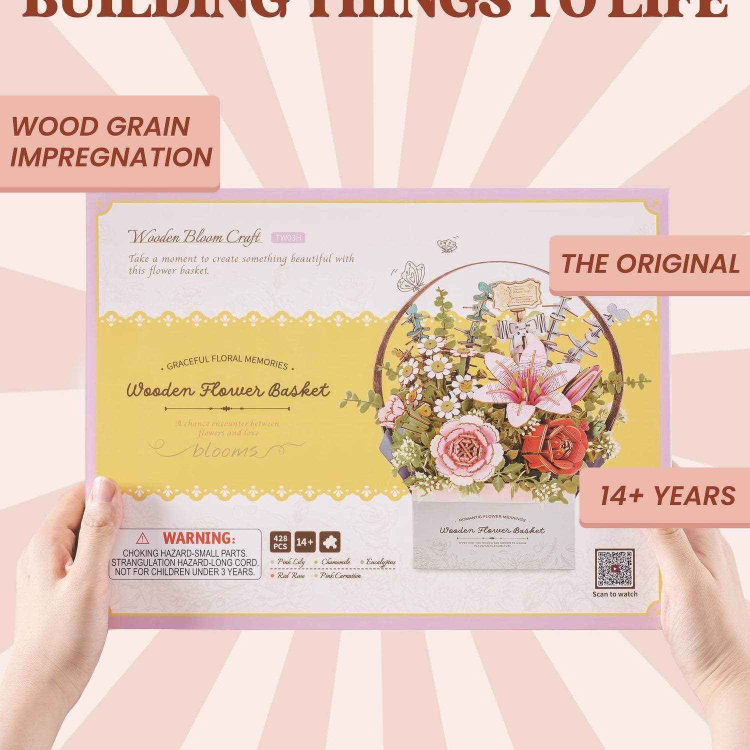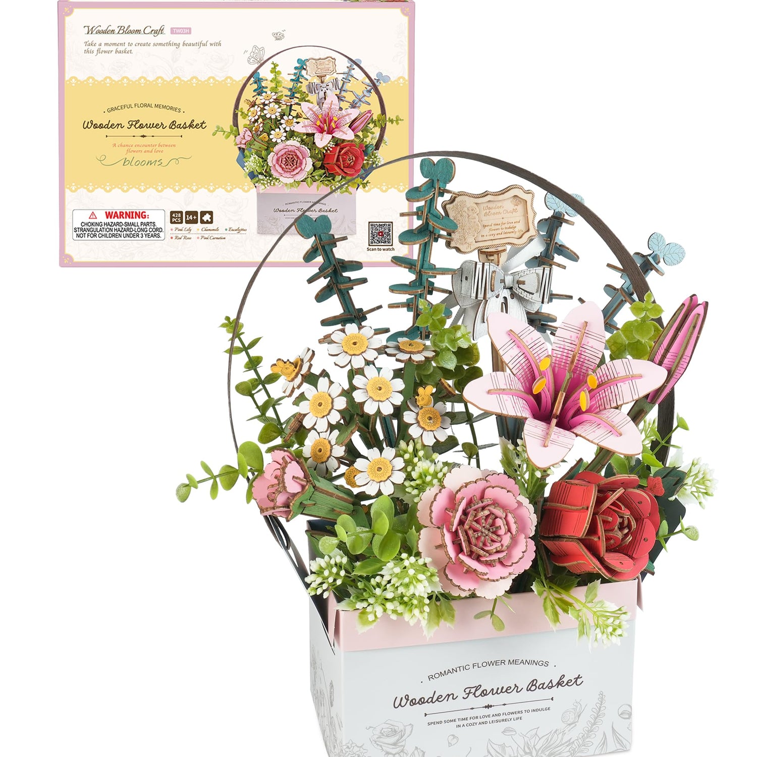 ROBOTIME 3D Wooden Puzzles for Adults, TW03H Wooden Flower Basket Craft Kit, Artificial Flowers Handheld Gift Box, Unique Gift for Birthday/Holidays/Homewarming