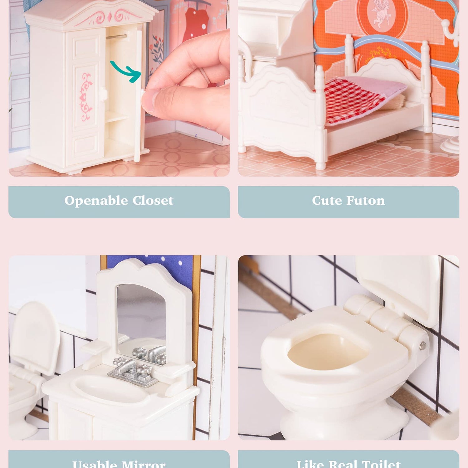 - 【Exquisite Dollhouse】Highly Realistic, Meticulously Decorated -ROBOTIME Dollhouse has 28 Lifelike Accessories: Living Room Sofa, Lamp, Kitchen Table, Chairs, Bathtub, Recliner, Toilet, Bed etc. Cabinet doors and drawers can be opened, the mirror also can be used.