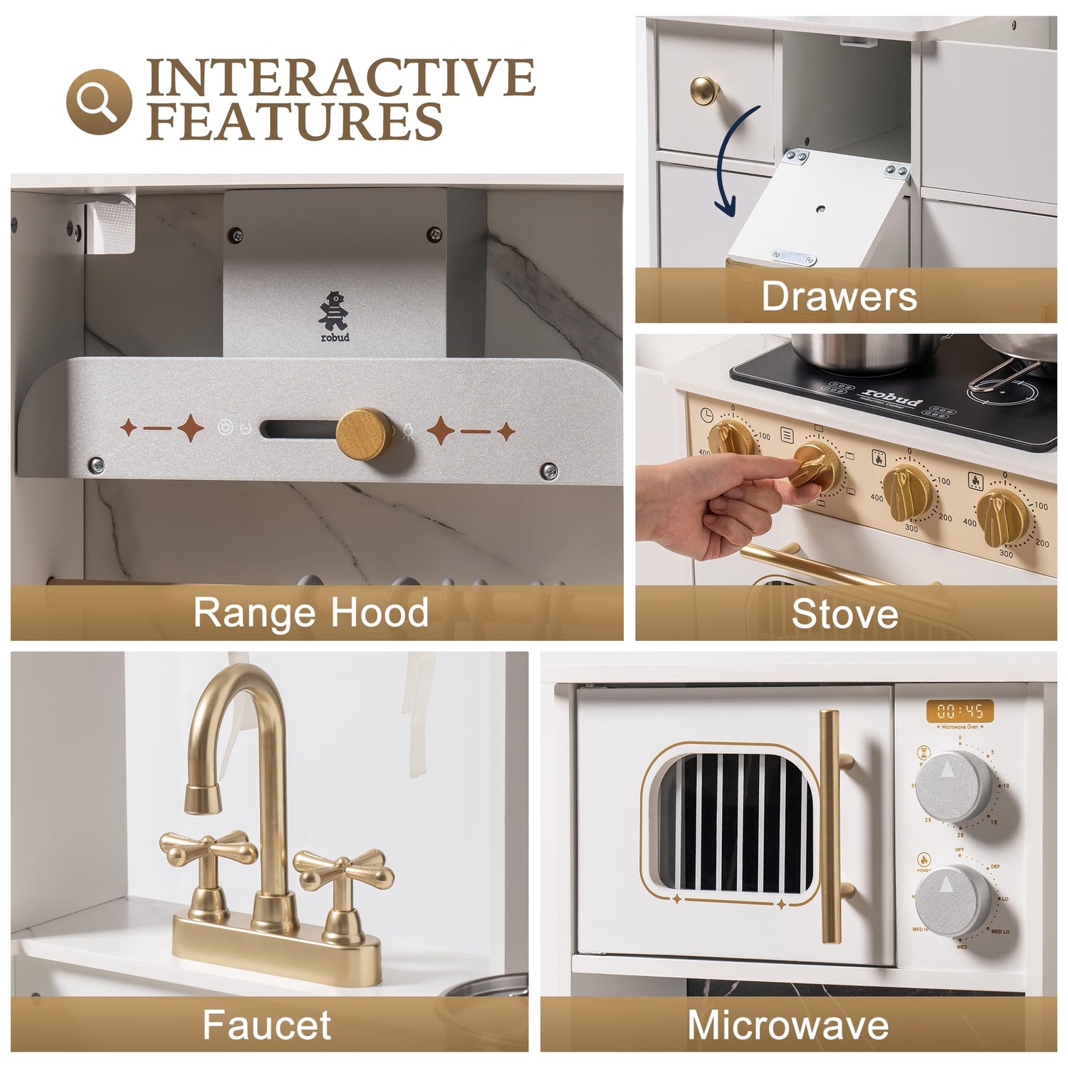 - REALISTIC DESIGN, SPARK CREATIVITY: The ROBUD White & Gold Deluxe Kids Kitchen Set features exquisite design and details like a real faucet, coffee machine, oven, and utensils, providing the most lifelike kitchen play experience to ignite your child's creativity and imagination.