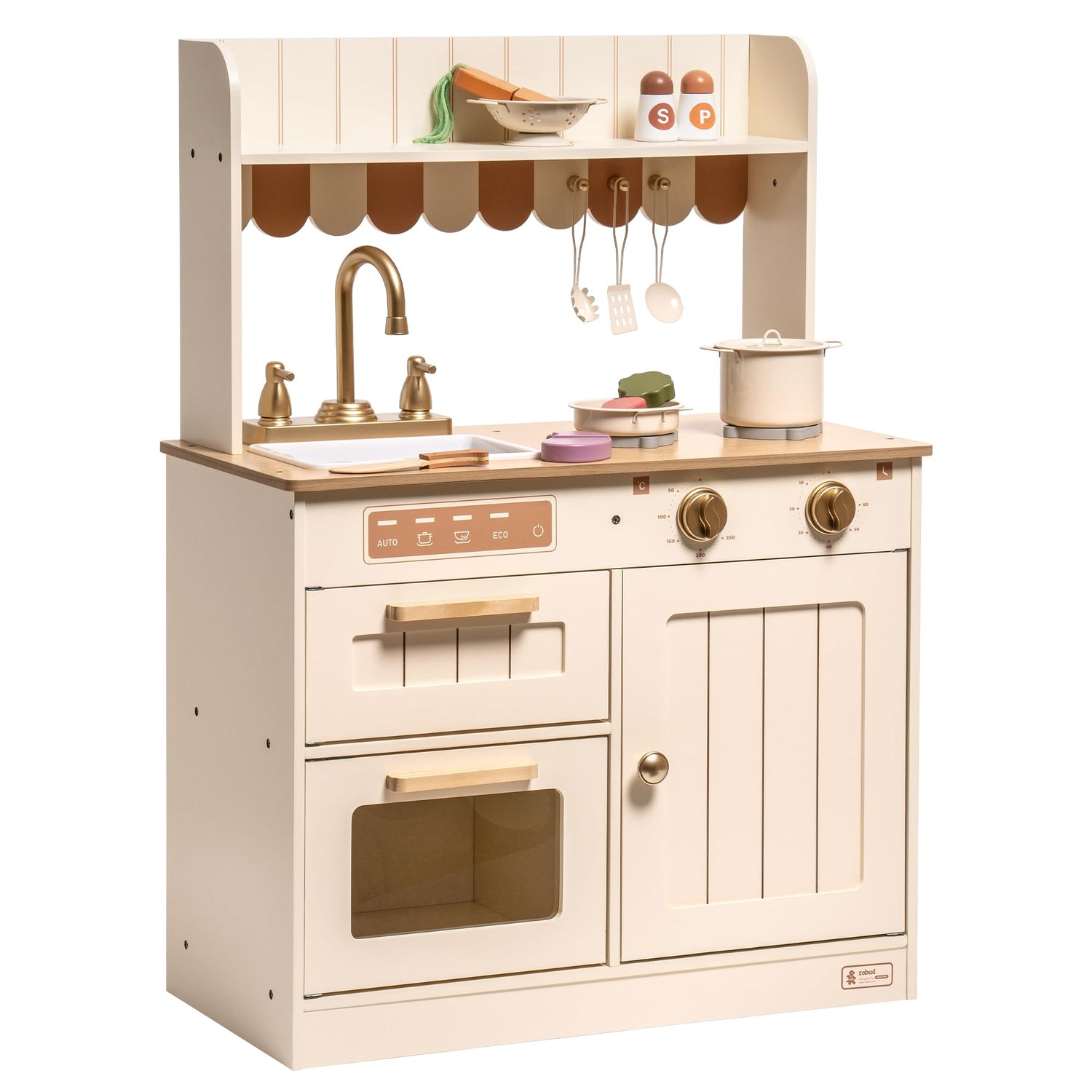ROBUD Wooden Play Kitchen Set for Kids, Pretend Play Kitchen Toy Set with Golden Faucet, Sink, Oven, Stove, Cabinet, Vintage Style, Gift for Boys & Girls, Ages 3+