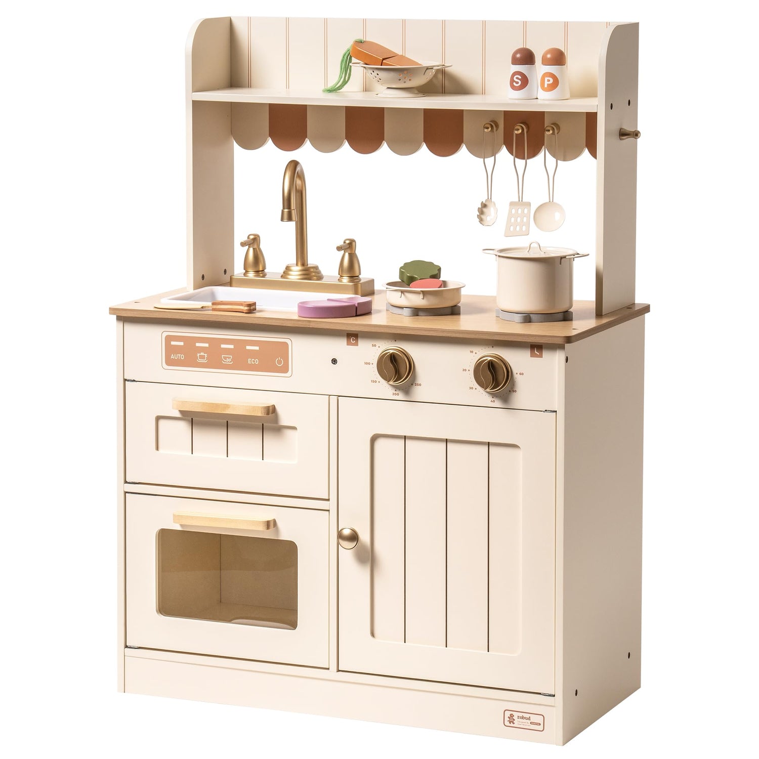 - REAL KITCHEN, REAL FUN: This play kitchen set has it all! With a sink and faucet, oven, shelves, cabinets, and all the kitchen basics, it’s like a tiny version of a real kitchen. Kids can dive into their pretend cooking world, whipping up dishes, organizing, and cleaning—just like grown-ups!