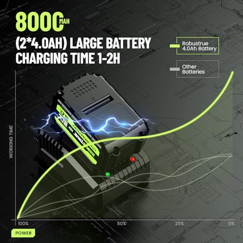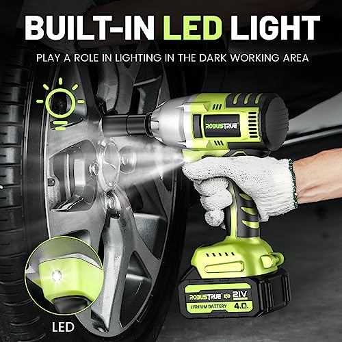 - 2x 4.0 Ah Battery & 1H Quick Charge: Robustrue electric impact wrench with 2*4000mAh large capacity batteries. Compared with 2.0Ah batteries, run time increased by 50%, say goodbye to frequent battery replacement, improve work efficiency. The high torque impact wrench shorted the charging time to 1H, saving your charging time. With a power indicator, check the remaining power easily