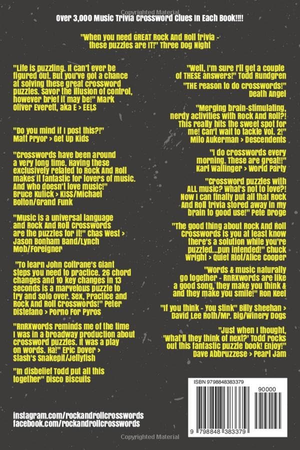 - "Crossword puzzles with ALL music? What's not to love?! Now I can finally put all that Rock And Roll trivia stored away in my brain to good use!" Pete Droge