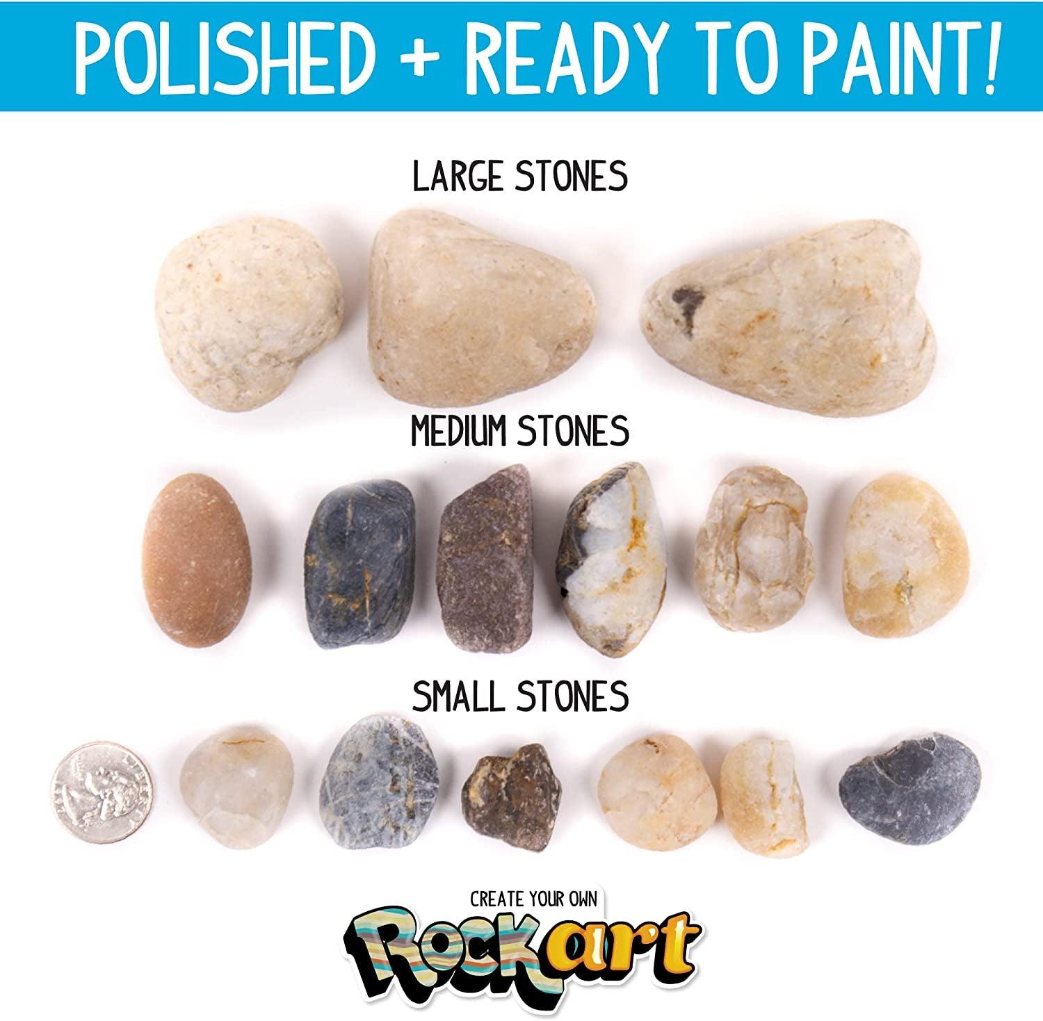 - 3 POUNDS OF POLISHED ROCKS: Transform 3 pounds of rocks in various shapes and sizes into unique works of art! From a cat to an astronaut, dinosaur to planets, the sky's the limit with what you can paint on these smooth-surface stones.