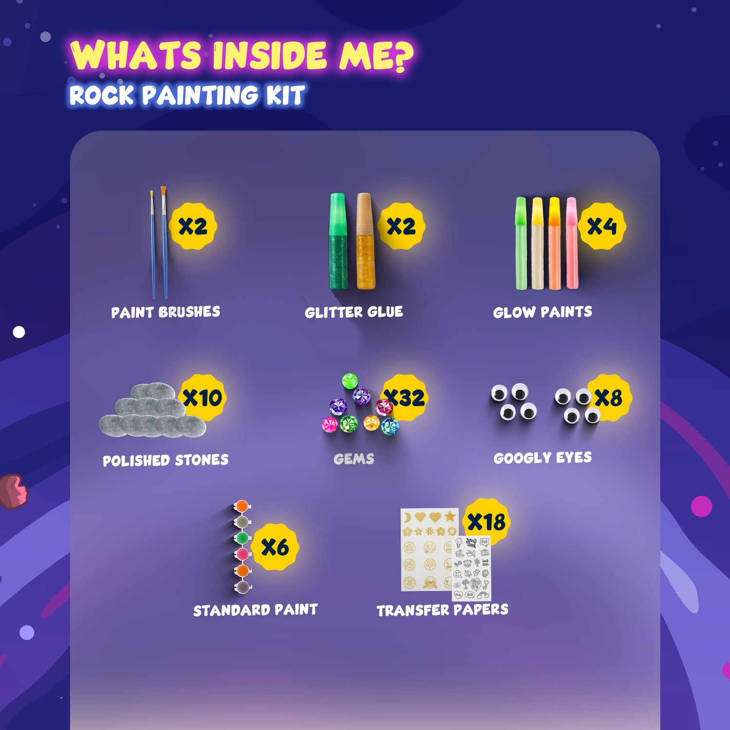 - Kids Crafts Art Kit: Dive into creativity with our rock painting kit featuring 10 rocks, 6 standard, 4 glow in the dark paints, 2 brushes, 2 glitter glues, 20 googly eyes, 2 transfer sticker sheets, 14 gems art supplies
