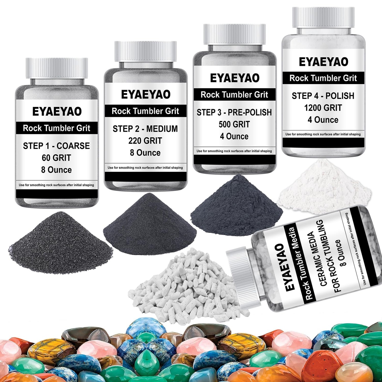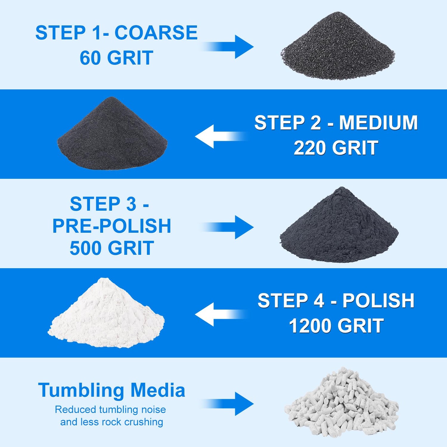 - CONTAINS - 8 oz. 60 Coarse Silicon Carbide Grit, 8 oz. 220 Medium Silicon Carbide, Grit, 4 oz. 500 Fine Silicon Carbide, 4 oz 1200 Aluminum Oxide Polish, 8 oz of Ceramic Tumbling Media