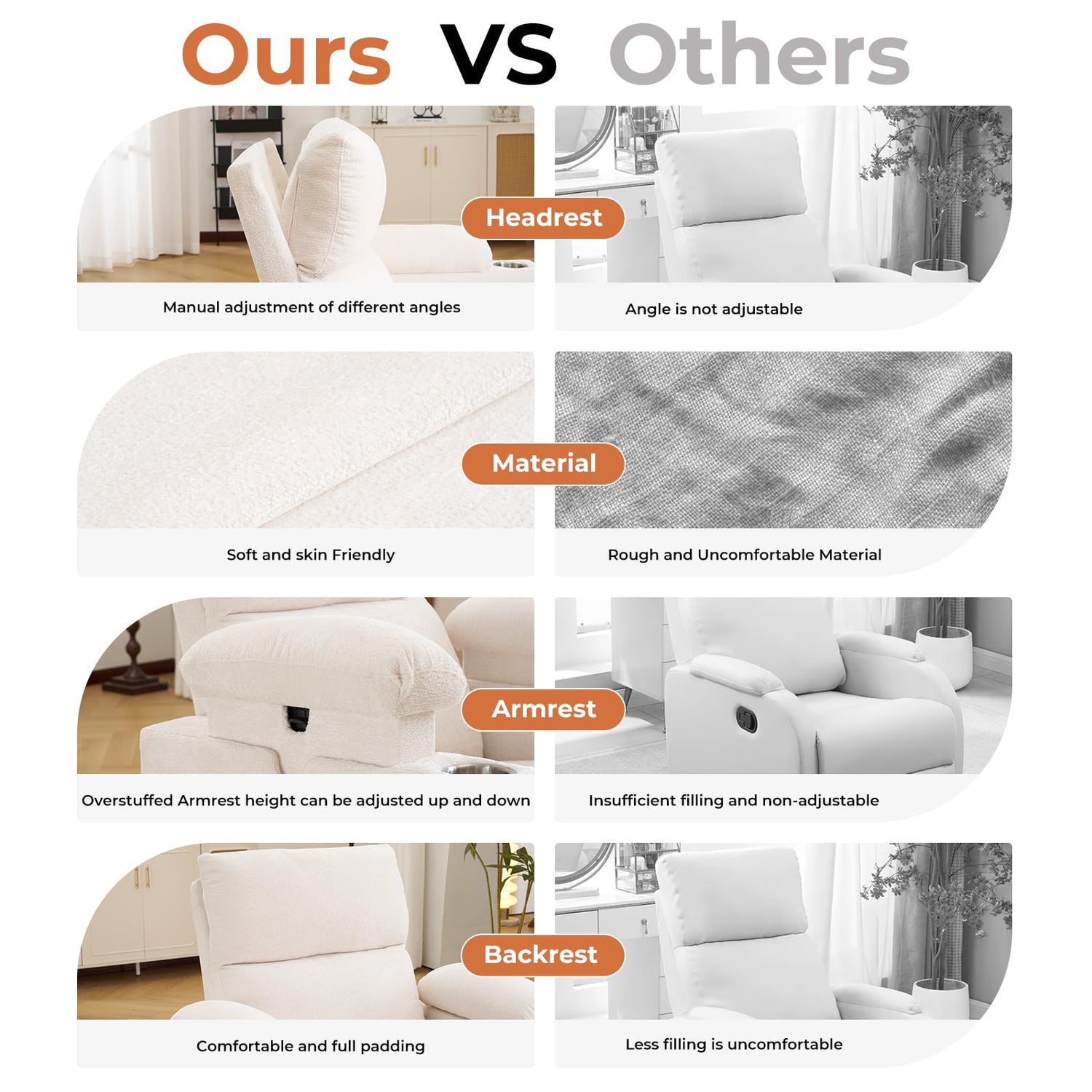 - Adjustable Headrest: The headrest of this power recliner gliders for nursery for adults. Can be manually adjusted to a variety of angles, and the nursery recliner is comfortable design helps reduce pressure on the neck and shoulders,providing comfortable support and making it easy to adjust to a comfortable position for you.Allowing you to watch TV or lean back without straining your neck or head for personalized comfort.