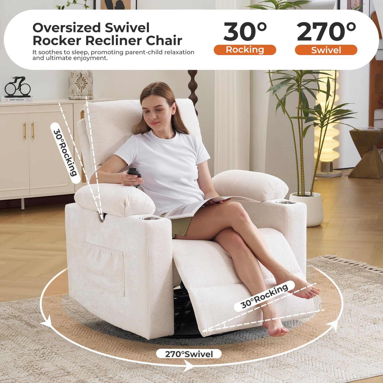 Rocking Chair Nursery with Adjustable Armrests, Electric Glider Recliner Nursing Chair for Breastfeeding, Power Swivel Recliner Chairs with Massage and Heat, Adjustable Headrest , FSC Certified, White