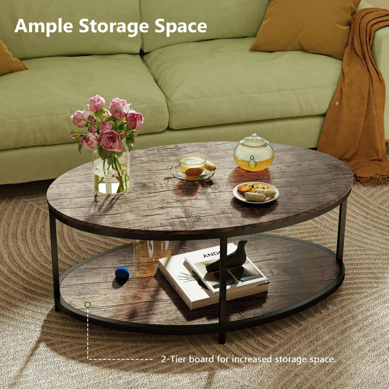 ROCSUMOO 43.3”Oval Coffee Table for Living Room, 2-Tier Coffee Table with Open Storage Shelf, Modern Wooden Side Table for Bedroom Home Office (Oval, Walnut)