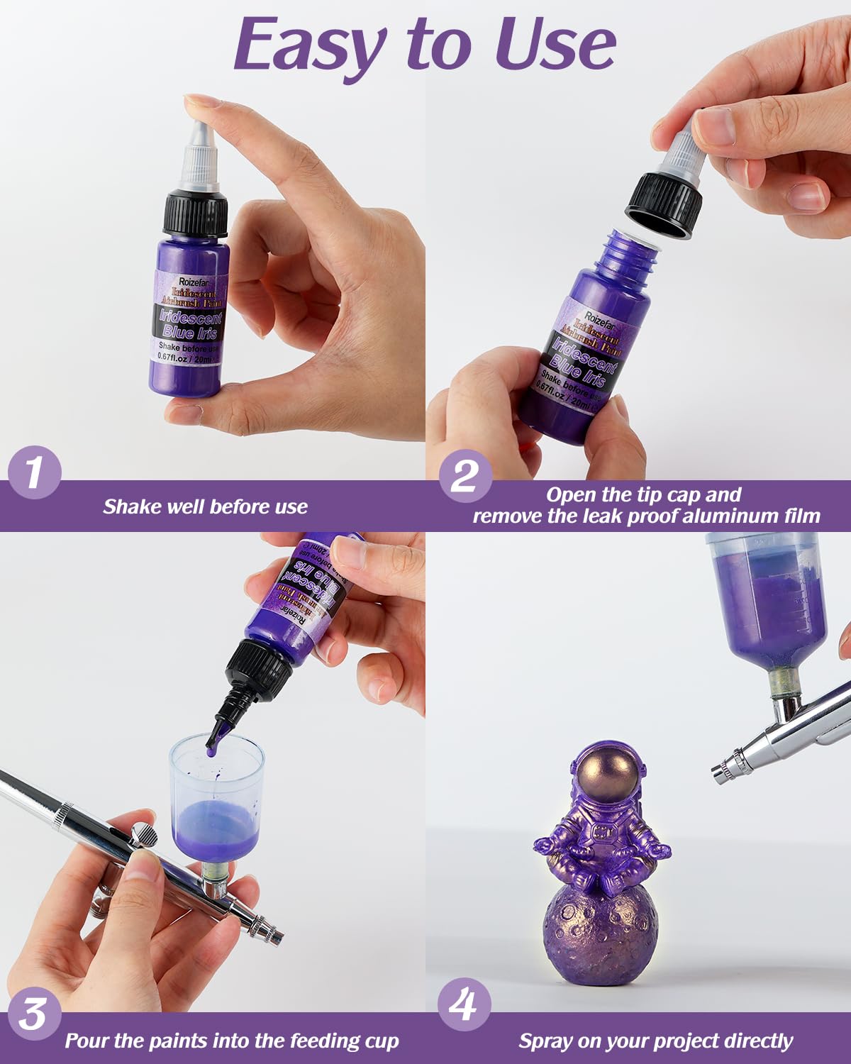 - Airbrush Paint Set: Roizefar airbrush kit contains 44 colors, including 24 classic colors, 6 neon colors, 6 Metallic colors, 8 Iridescent colors, also comes with 6 airbrush thinner. A variety of pigment will meet most of your painting demands without mixing process. Each bottle is 20ml