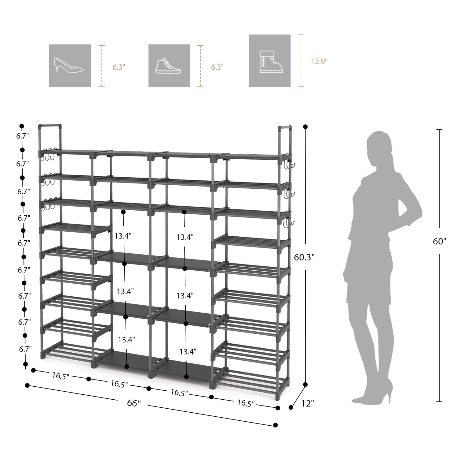 - 【Extra-large Capacity】: Are you looking for a larger capacity shoe rack? ROJASOP large 9-tier shoe rack Size 66"L x 12"W x 60.3"H Inches. The tall shoe rack can stores up to 68 pairs adult shoes, different height levels fit from loafers, boots and high heels or other larger accessories, enough for you and your family's daily life. The shoe rack for closet is perfect install at your home, in office garage or dorm room.