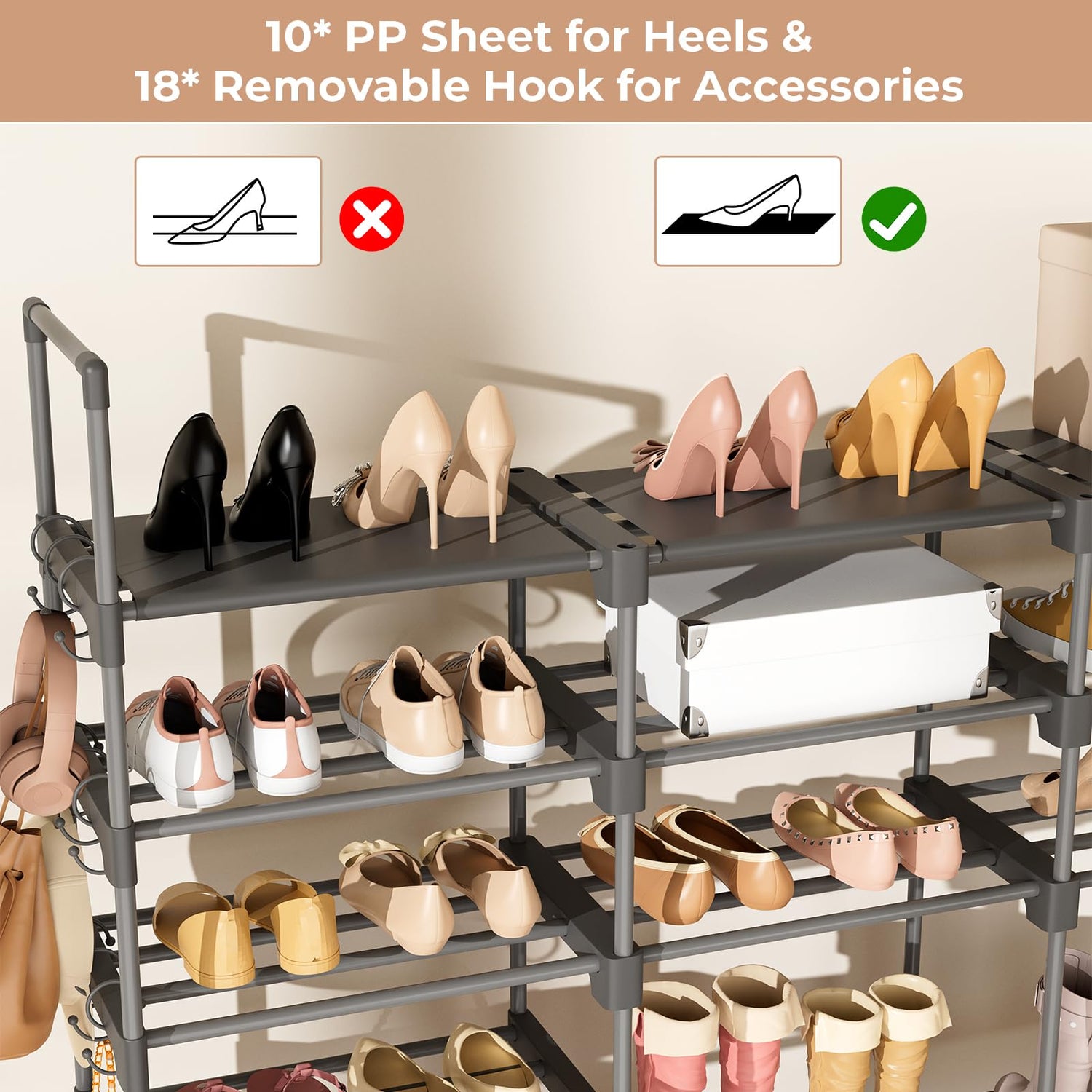 - 【Easy To Assemble,Buy With Confidence】:Come with one metal shoe rack,18 pcs removable hooks,1 wooden hammer,a user manual to help you assemble the shoe shelves shelf quickly and easily according to the manual.It is easier and faster to install the plastic connector with a small mallet.Please place high heels on the PP plastic sheet.If you have any questions,please contact us without hesitation.We will attempt to resolve any issues and ensure your contentment.